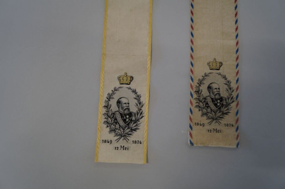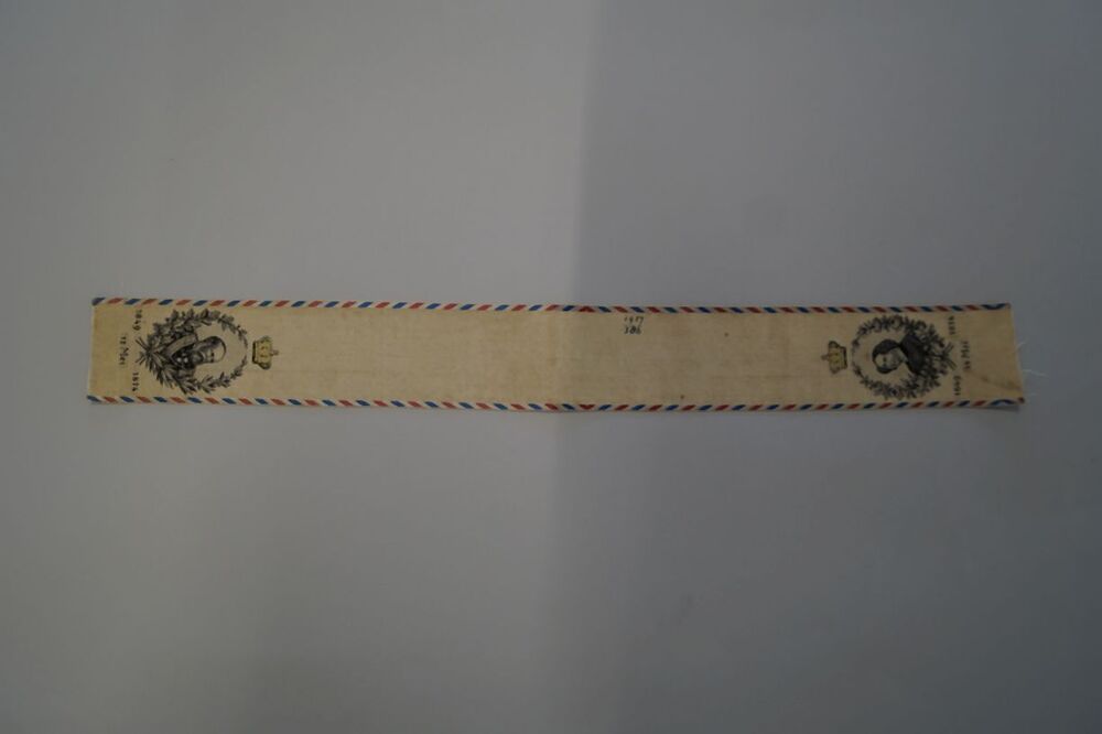 Oranjelintje met afbeelding van Koning Willem III en koningin Sophie, 1849-1874, 12 mei, ter gelegenheid van het 25 jarig koningschap, met oranje afgezet