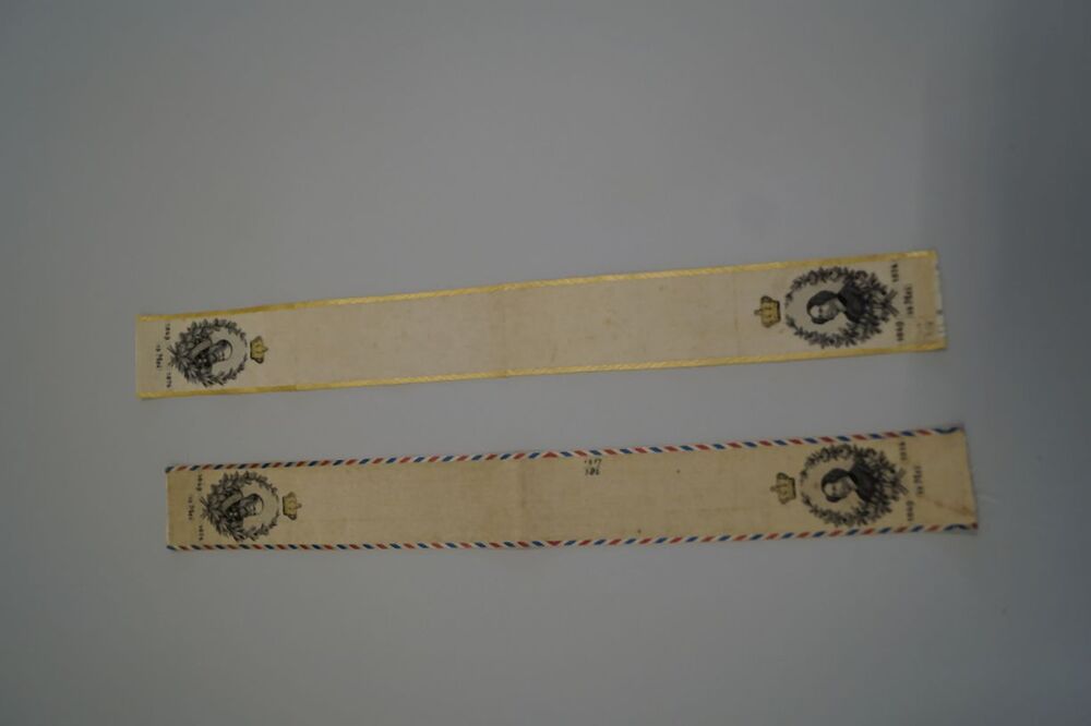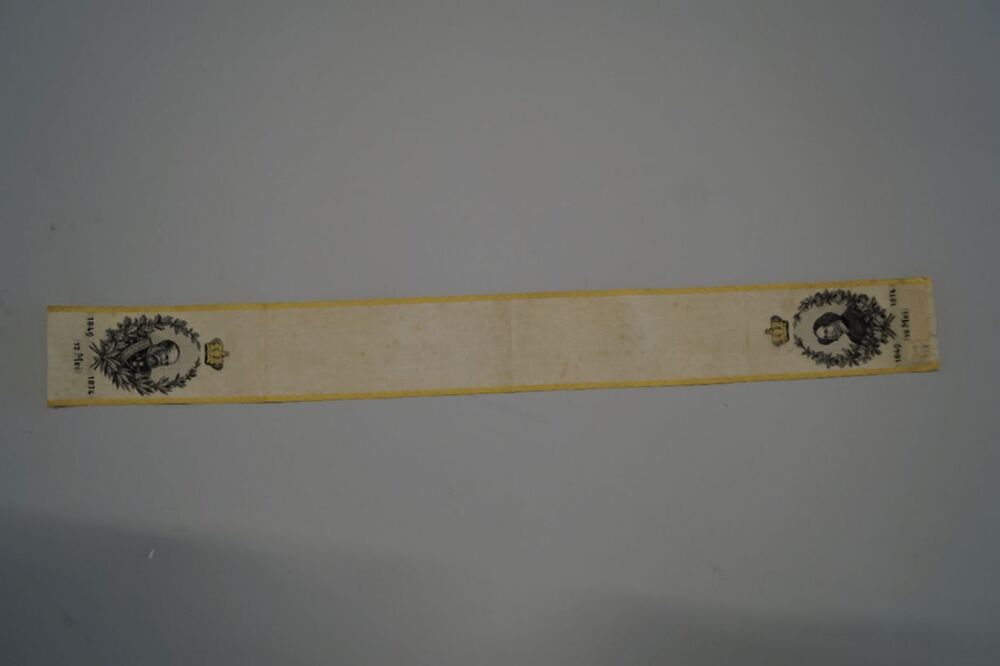Oranjelintje met afbeelding van Koning Willem III en koningin Sophie, 1849-1874, 12 mei, ter gelegenheid van het 25 jarig koningschap, met rood, wit en blauw afgezet. Inventarisnummer met inkt opgeschreven