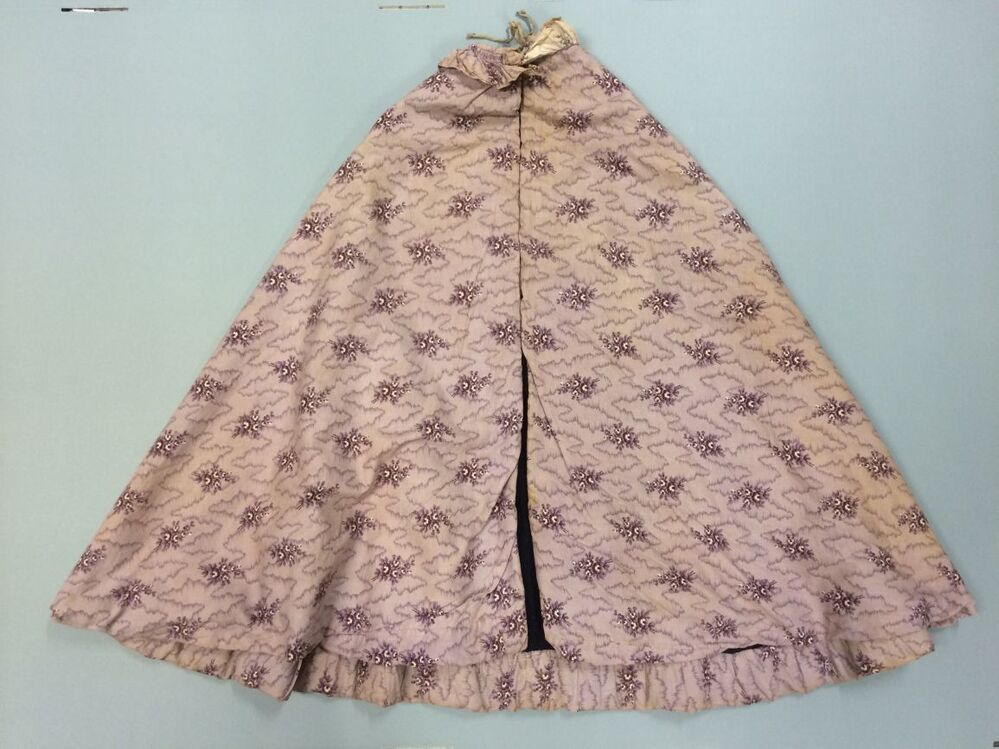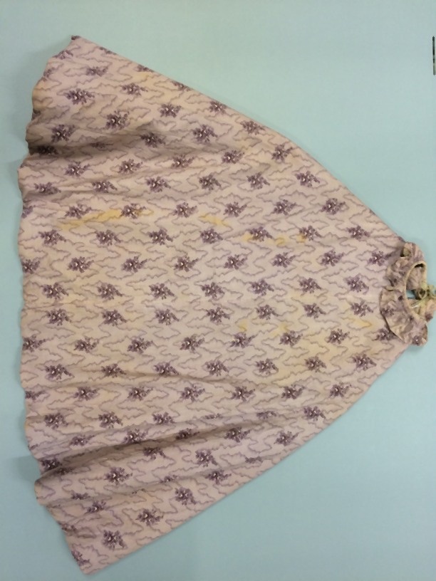 Kraamvrouwenbedmantel van violette gewatteerde katoen, met bloemruikertjes versierd, gevoerd met donkerblauwe stof