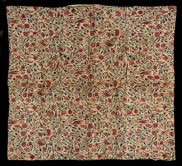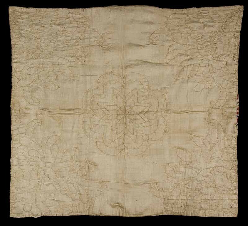 Sitsen doorgestikte wiegendeken met slingerende bloemranken op witte grond, gevoerd met crème zijde, met doorgestikte vazen in de hoeken en rozet in het midden