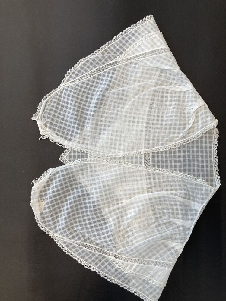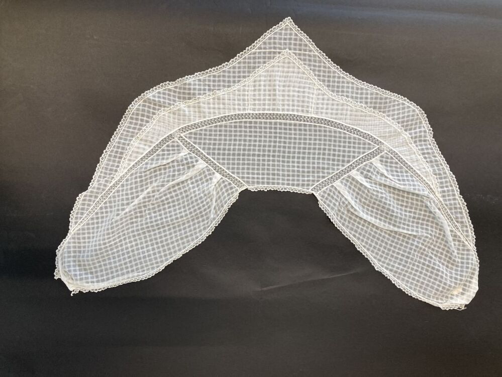 Schouderkraag van wit geruit neteldoek, verfraaid met kloskant en tule doorstopwerk