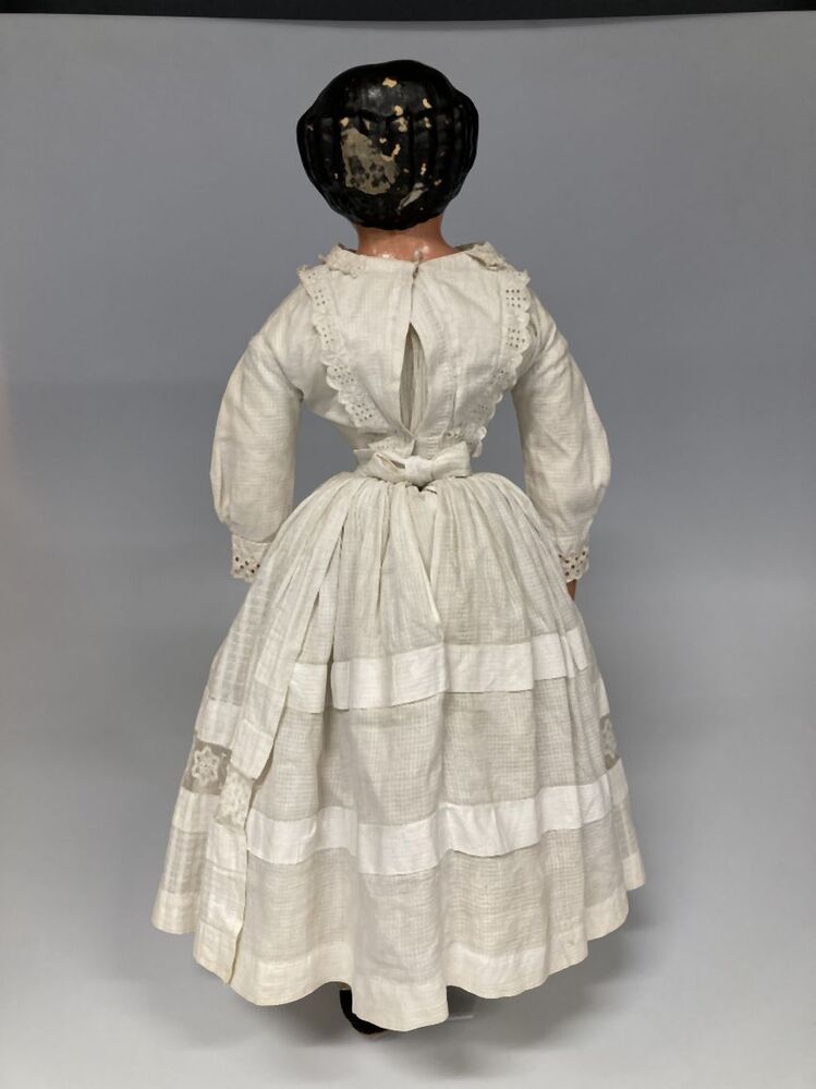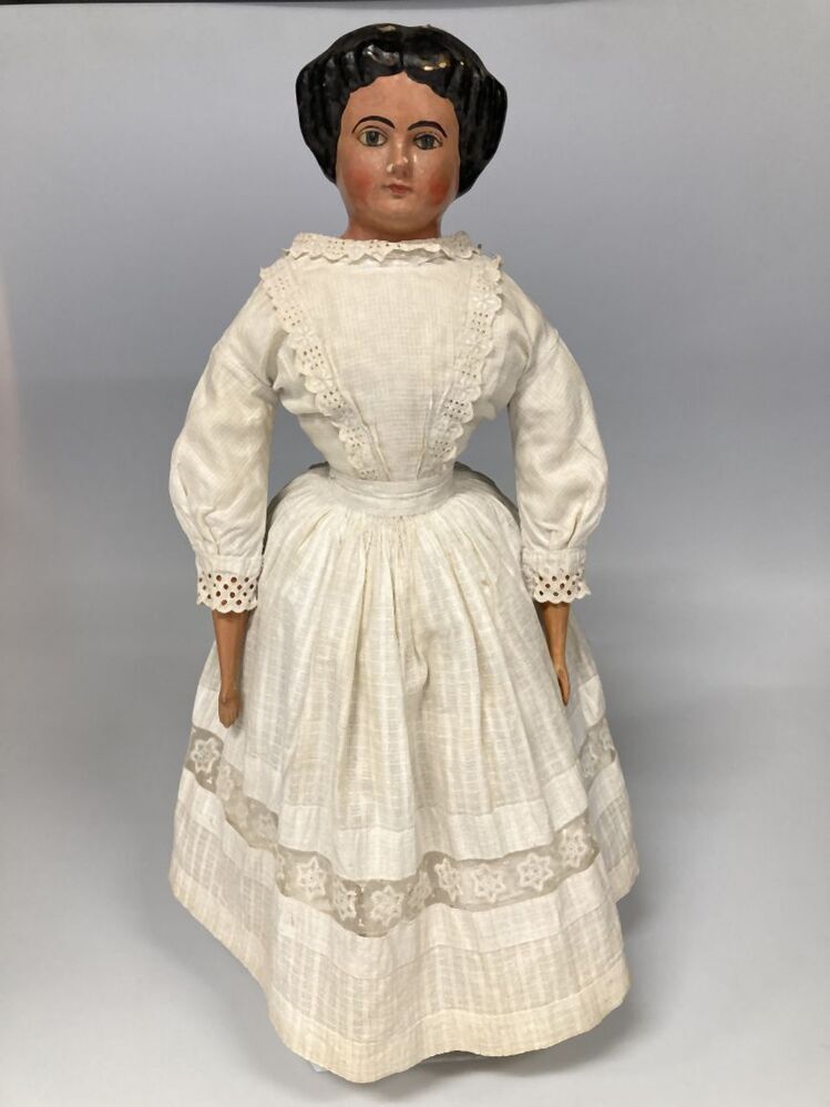 Pop van beschilderd papier maché in witte jurk