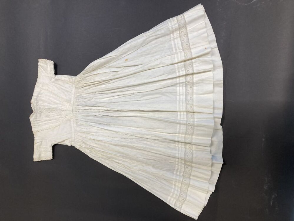 Doopjurk met wijde lange rok van wit katoen met ingeweven bloemetje en wit borduursel