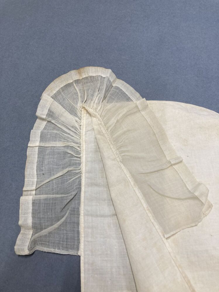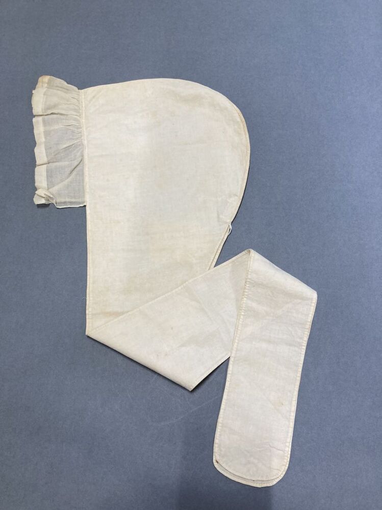 slaapmuts, wit met lange linten welke boven het hoofd worden gestrikt,