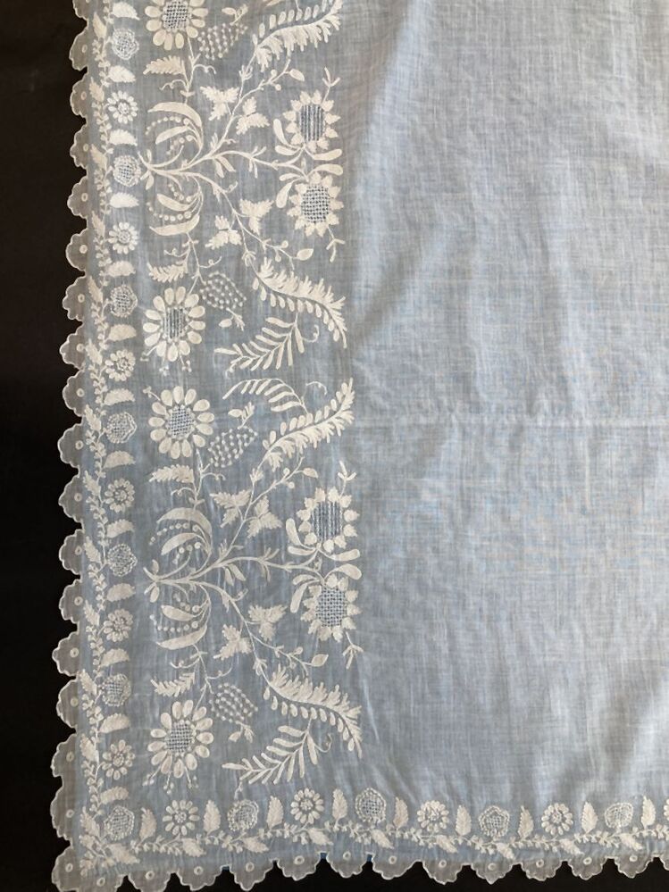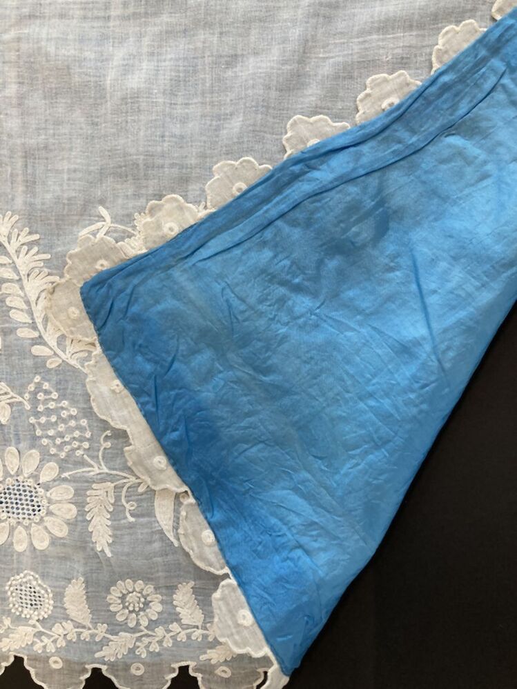Schort van wit batist met getamboereerde rand florale motieven, gevoerd met blauwe zijde