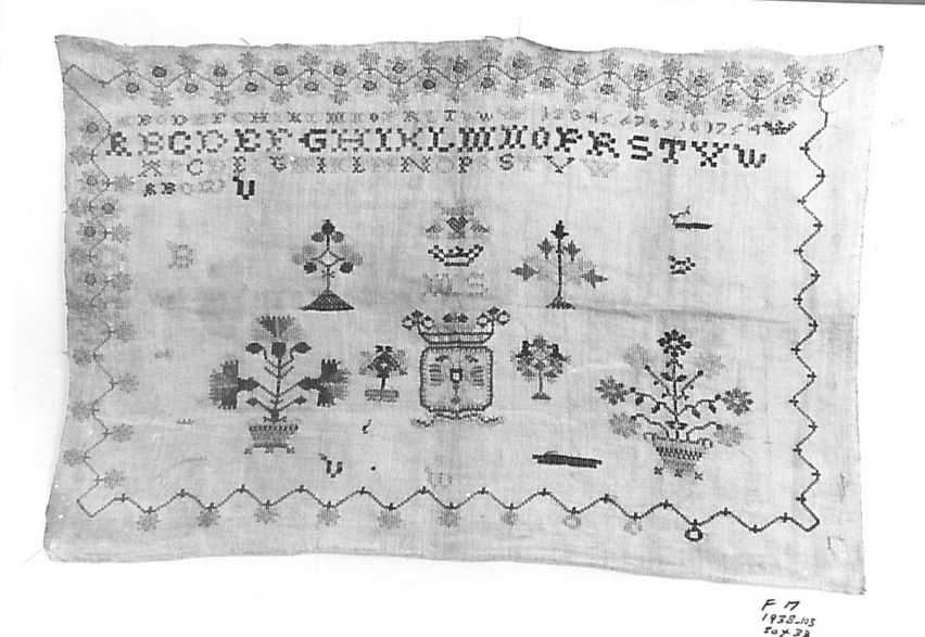 Merkletterlap van wijdmazig linnen, wapen met dubbele adelaar, initialen MS, 1754