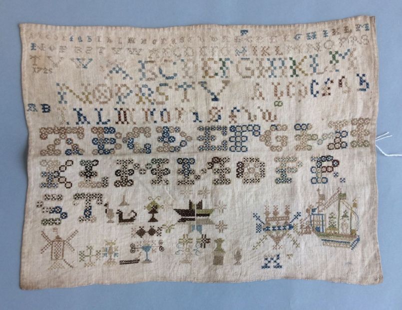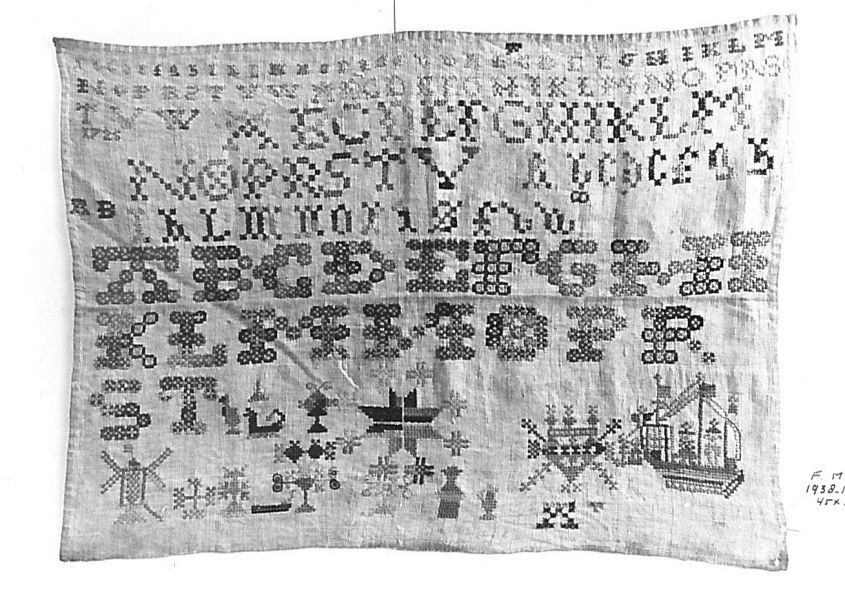 Vrij grove lettermerklap van linnen, geborduurd met zijden garen met zeven en een halve rij alfabetten, enkele merken waaronder een boot