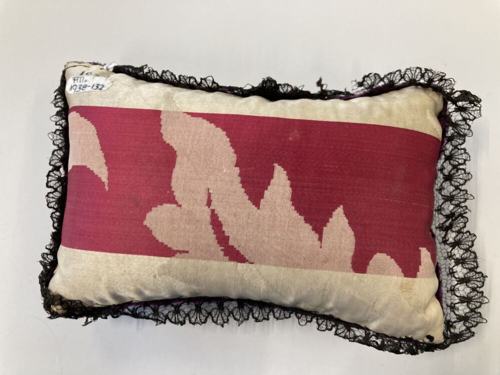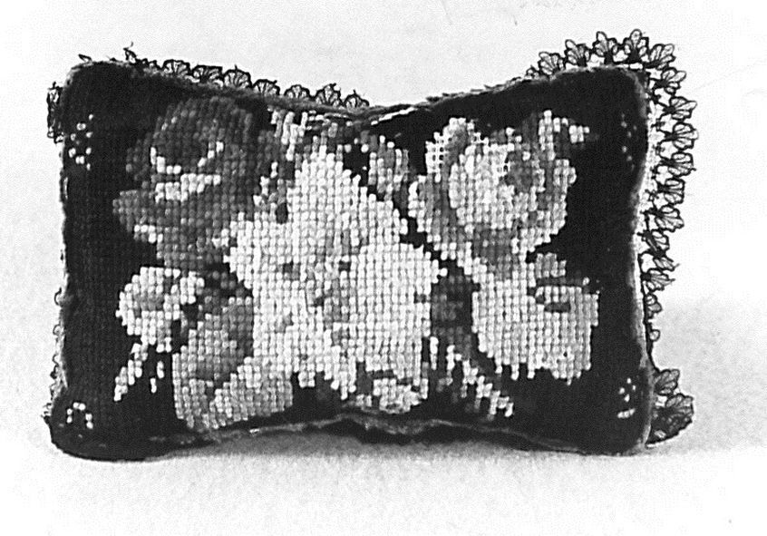 Speldenkussen met bloembouquet in groen, rood, geel en beige