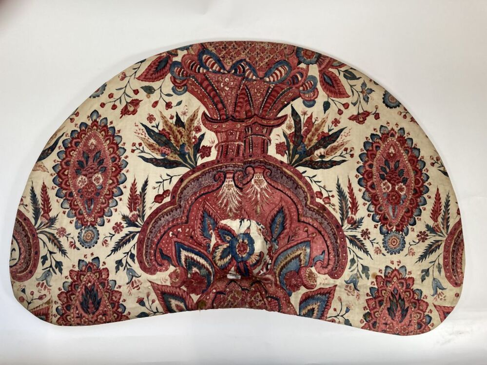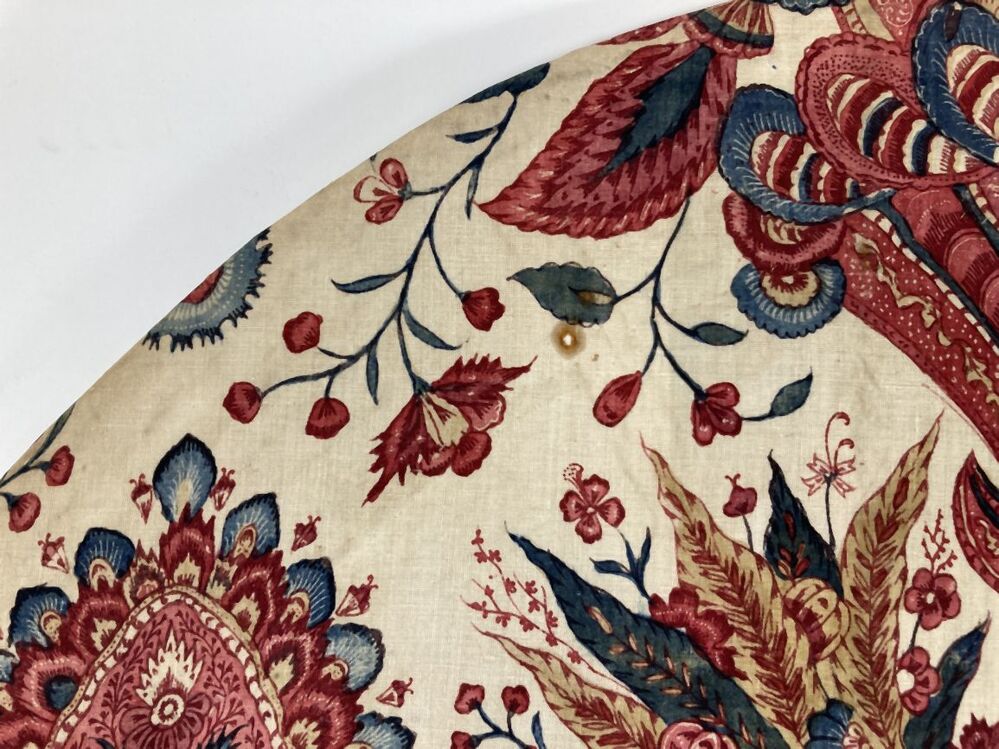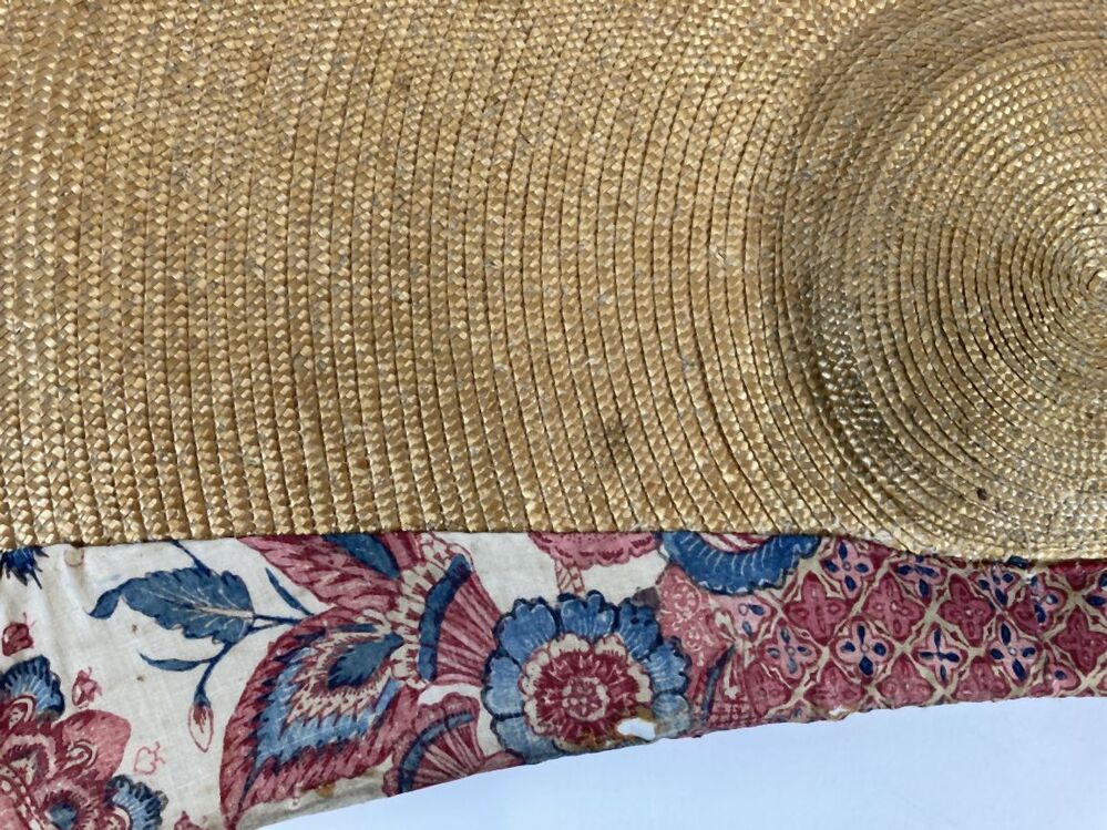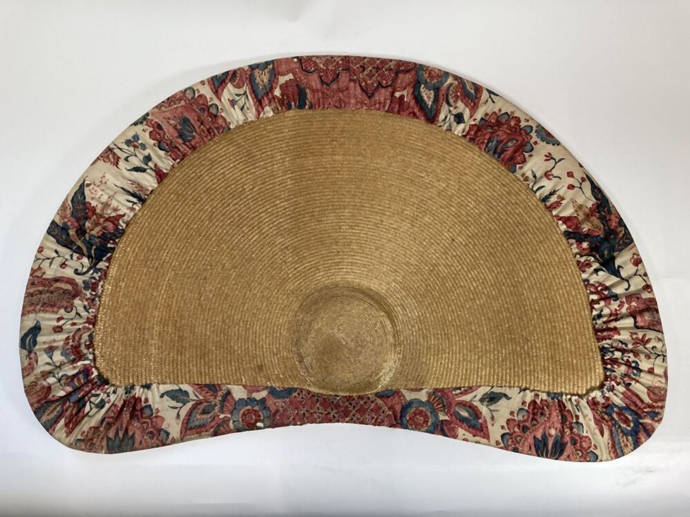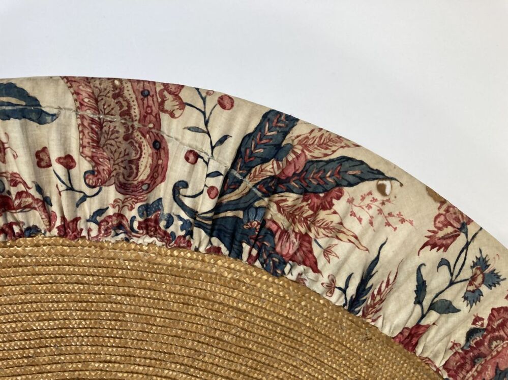 Zonhoed met sitsen voering beschilderd met grote palmetten en spitsovalen op witte grond