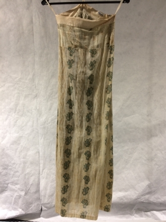 Rok, behorende bij kostuum-jak van écru-katoen met ingeweven streep, bedrukt in banen met bruine aren en willekeurige groene vlakken