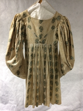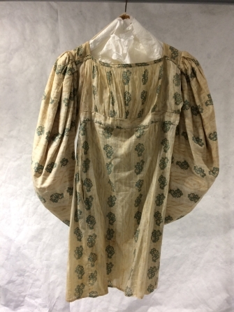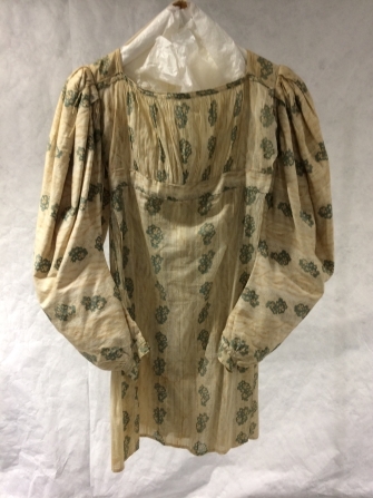 Kostuum-jak van écru-katoen met ingeweven streep, bedrukt in banen met bruine aren en willekeurige groene vlakken