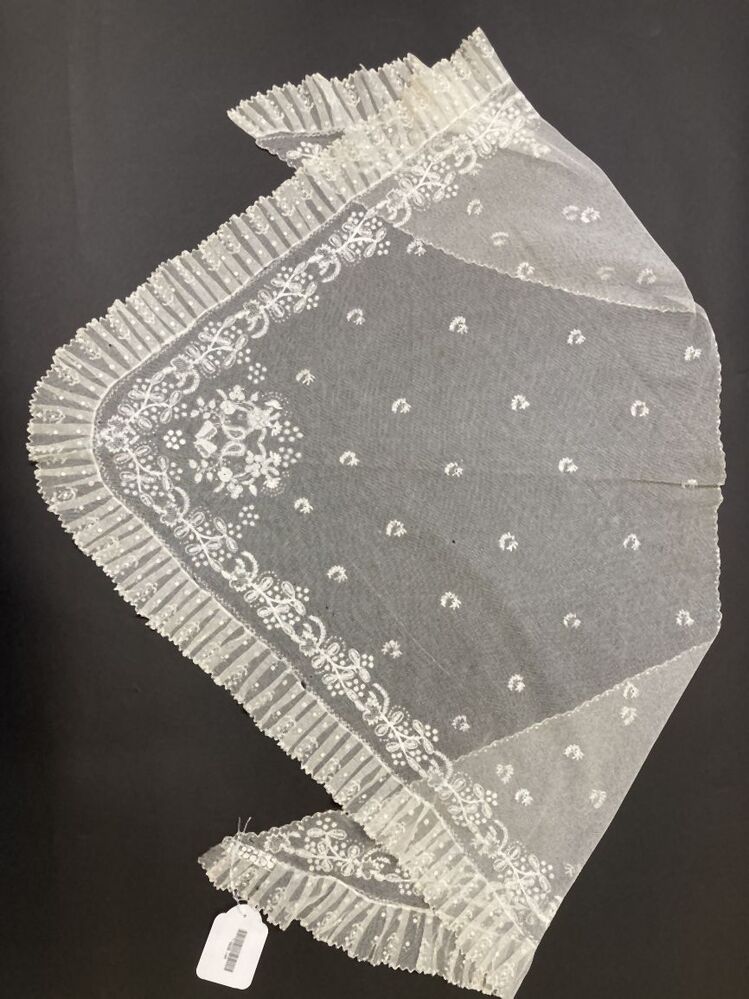Witte tule fichu tamboereerwerk florale rand, strooimotiefjes met langs de korte zijden een brede geplooide strook