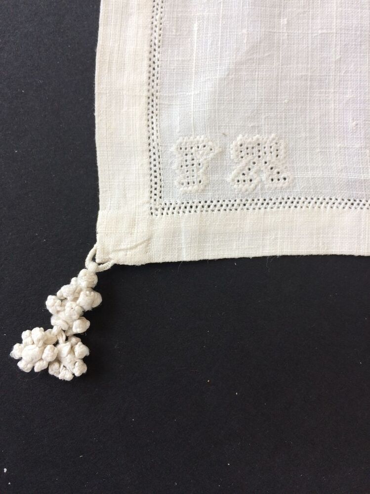 en akertjes aan de hoekpuntenZakdoek van fijn wit linnen met initialen FA