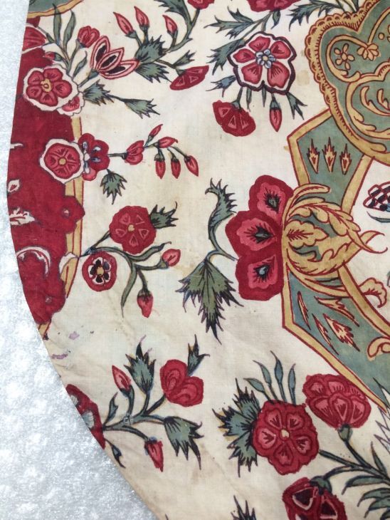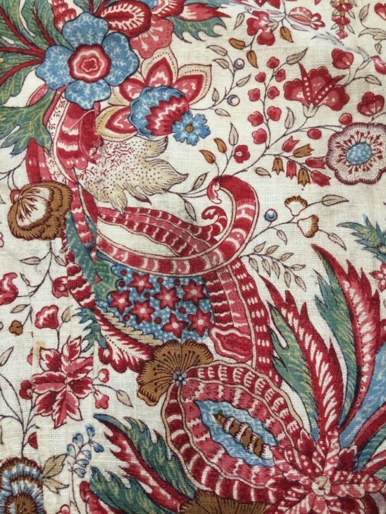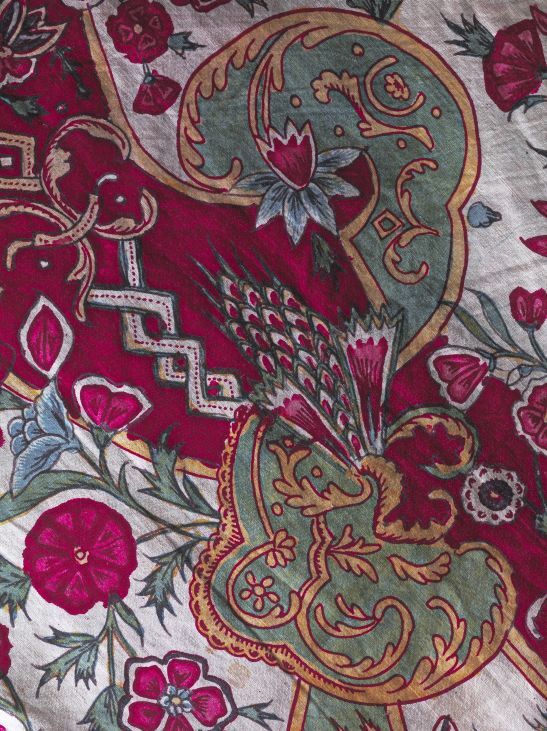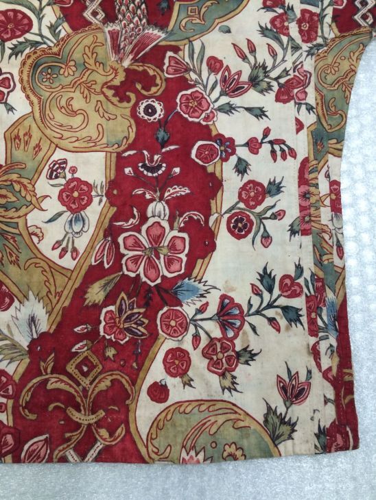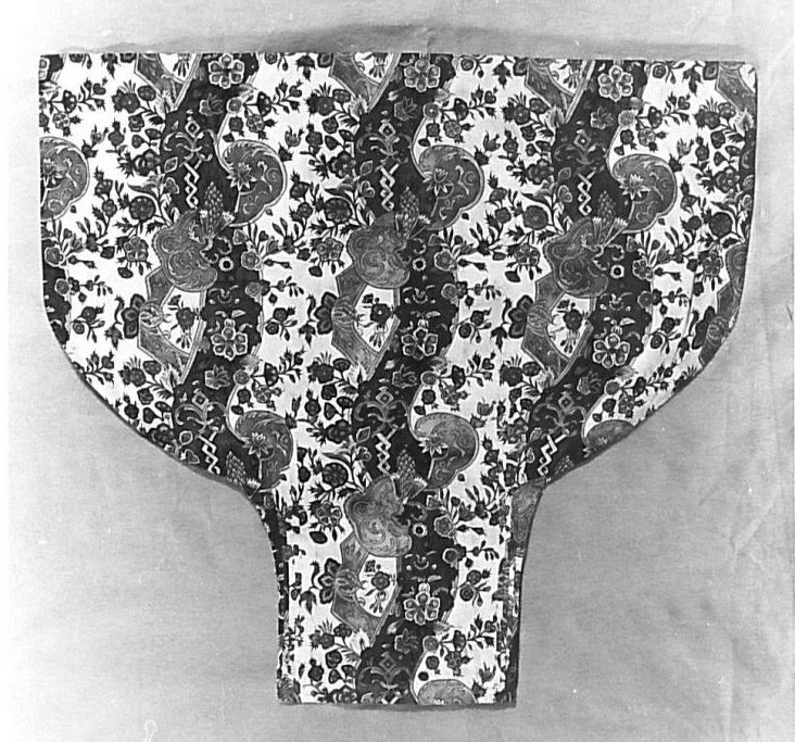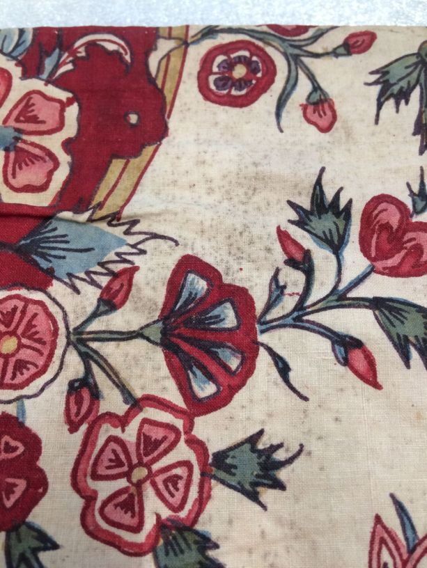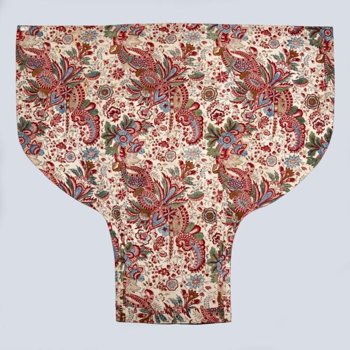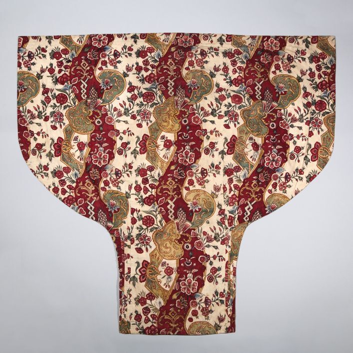 Sitsen wikkelkleed voor baby met brede golvende banen waaruit bloemen spruiten op witte grond, geïnspireerd op ontwerp van Daniël Marot