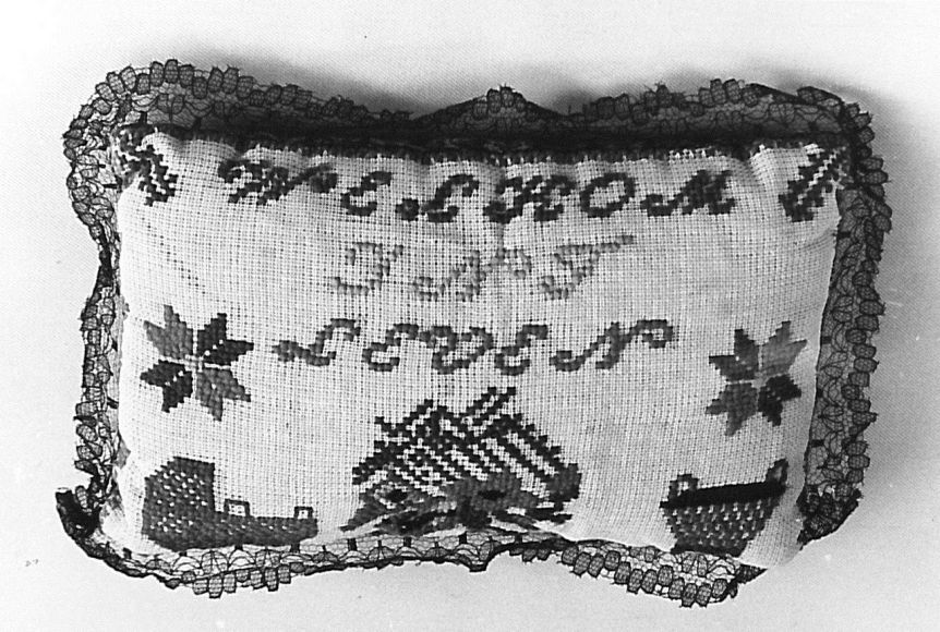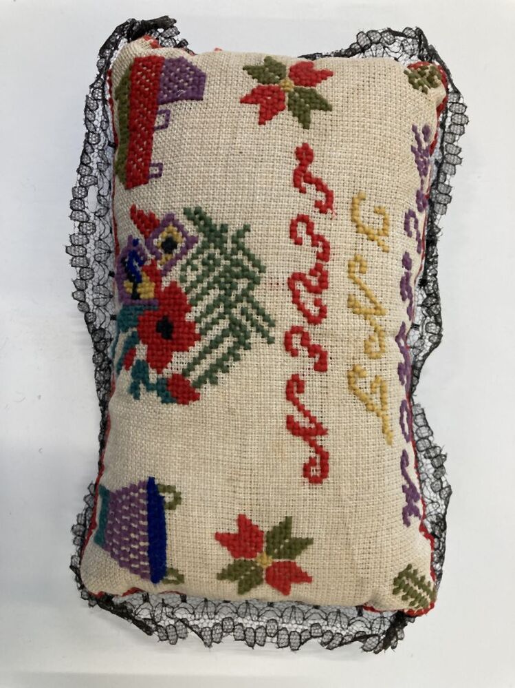 Speldenkussen met de woorden 'welkom int leven'