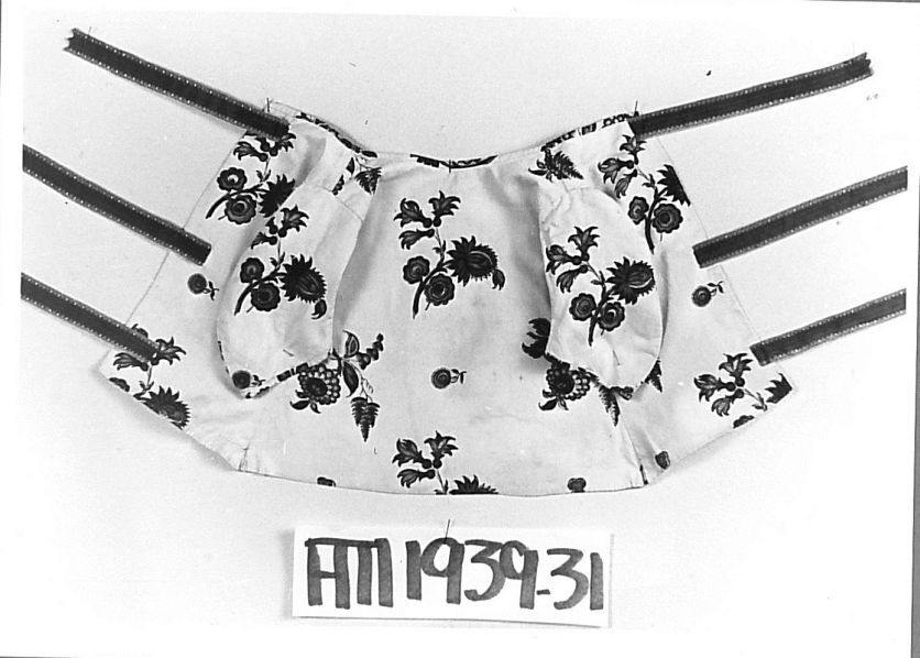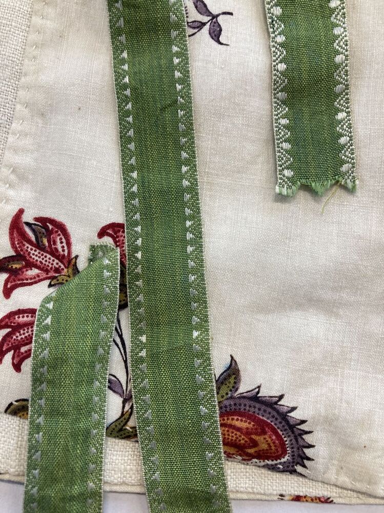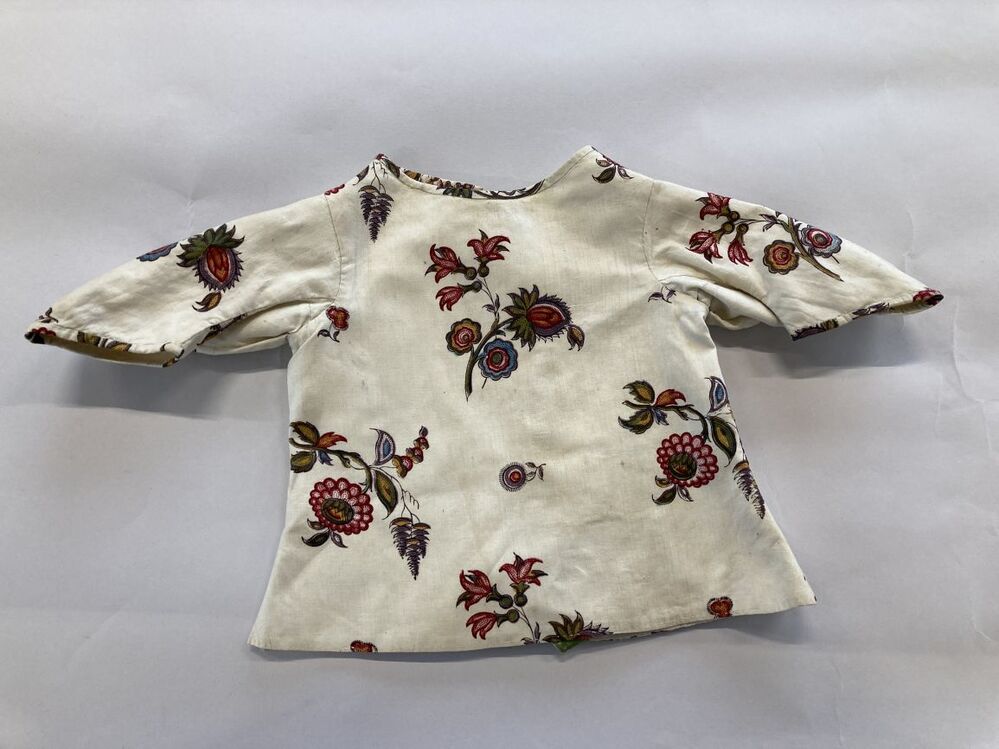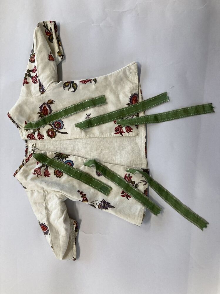 Bedrukt katoenen babyjakje, met losse boeketjes op witte grond en sluiting van zijden linten op de rug