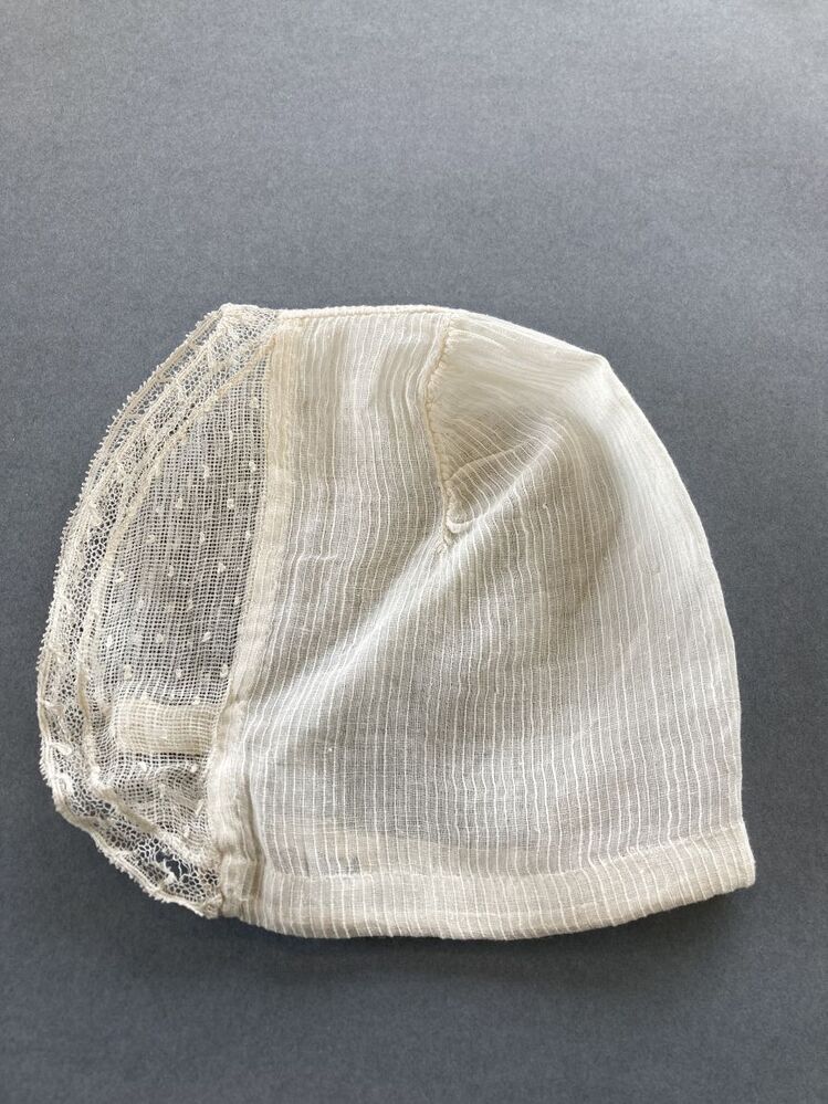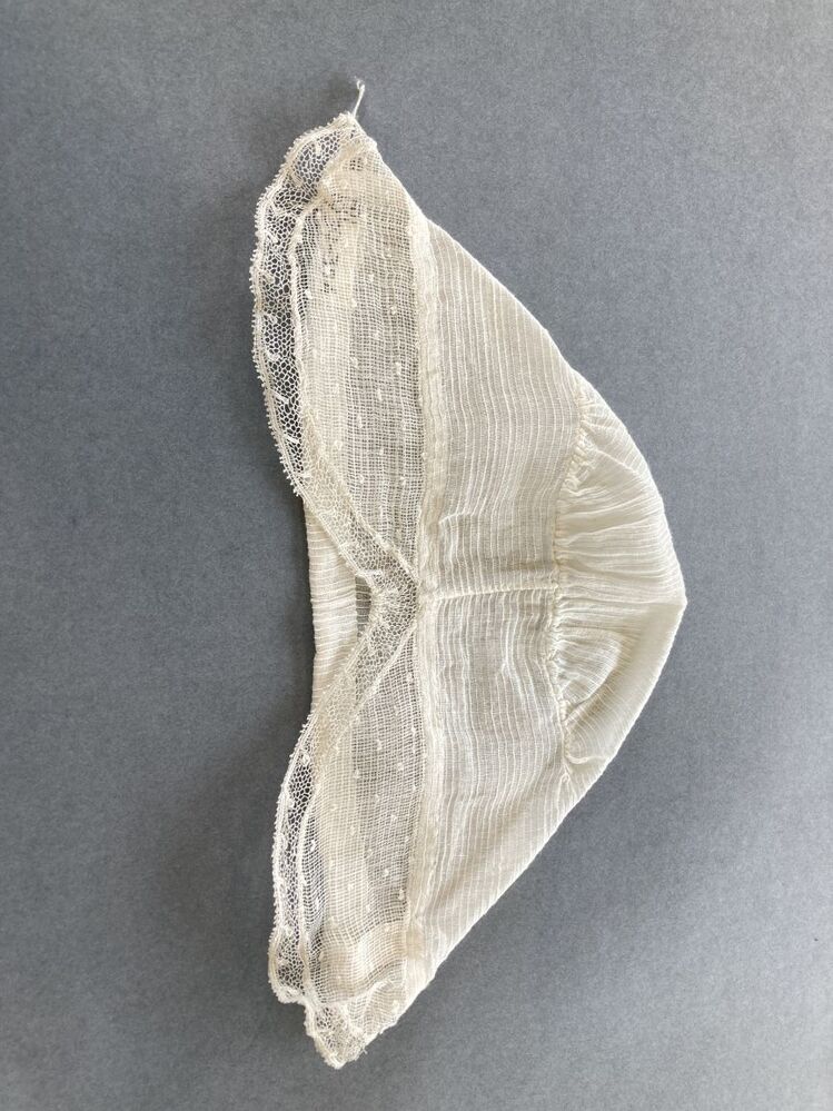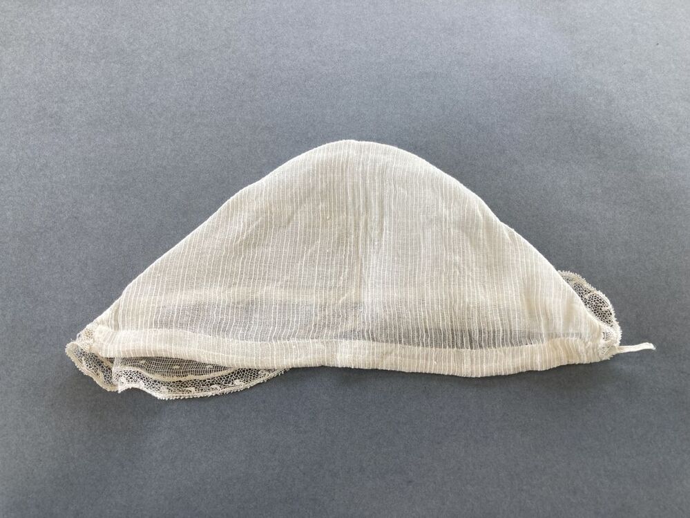 Muts van gestreept neteldoek met gebogen strook langs gezicht afgezet met kant