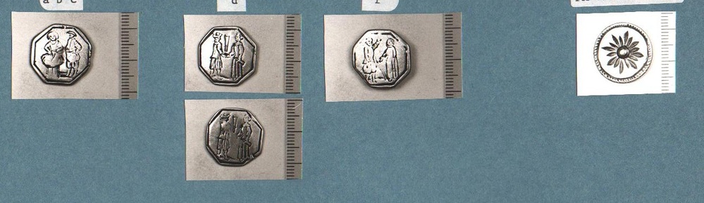 Zes platte achtkantige knopen met achterop een oogje, op de voorkant van de knoop verschillende staande figuren