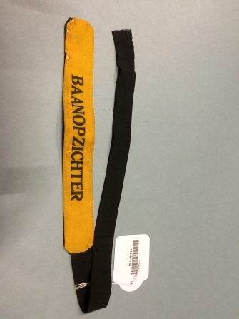 Gele hoedband met in zwarte letters het woord baanopzichter, samen binnengekomen met vergelijkbaar exemplaar