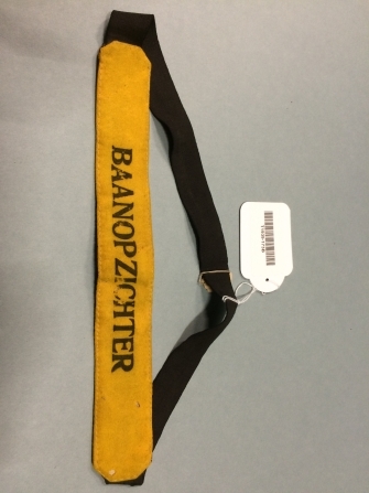Gele hoedband met in zwarte letters het woord baanopzichter, samen binnengekomen met vergelijkbaar exemplaar