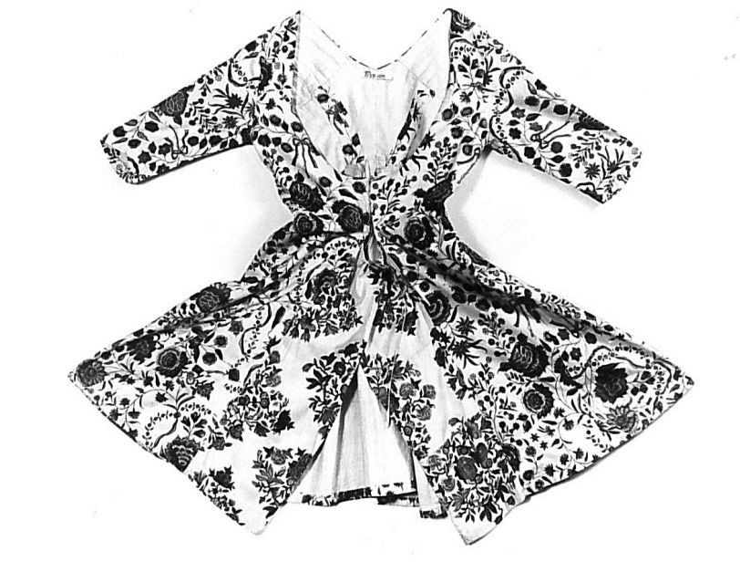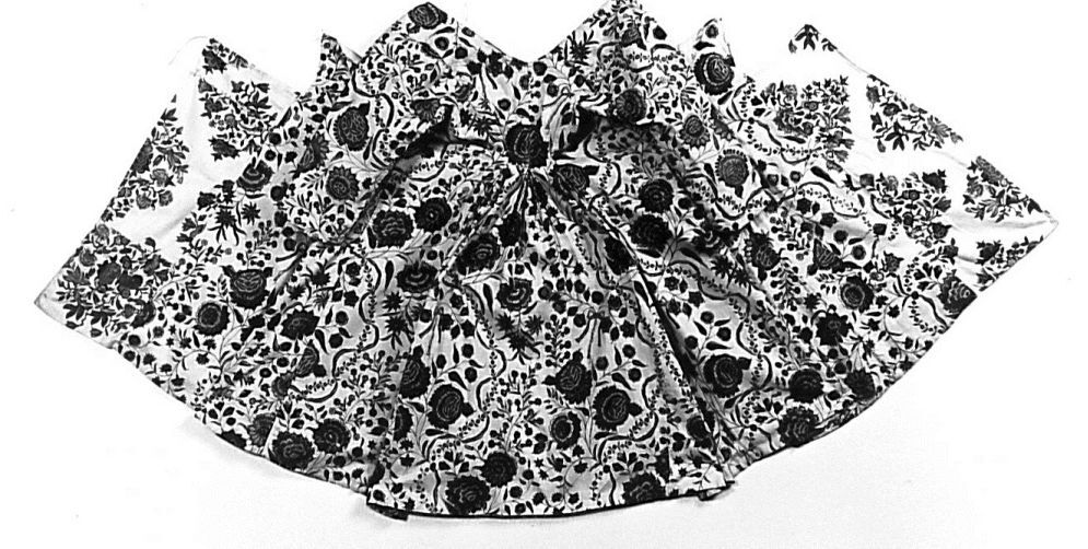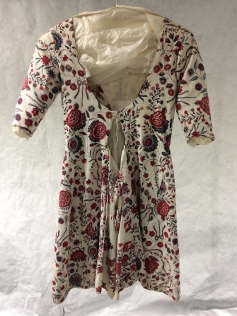 Sitsen vrouwenjak, met ingezet voorpand van afwijkende sits, met bloemranken met een slingerend lint ertussen, het voorpand met bloemen geordend in ruiten op witte grond