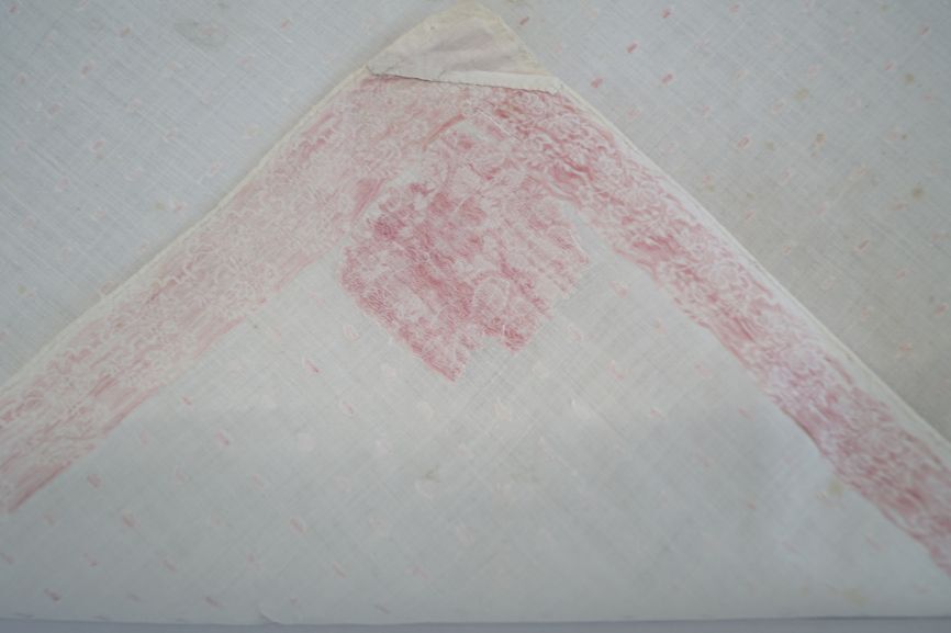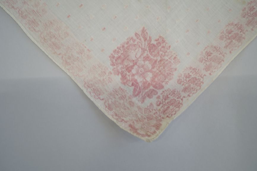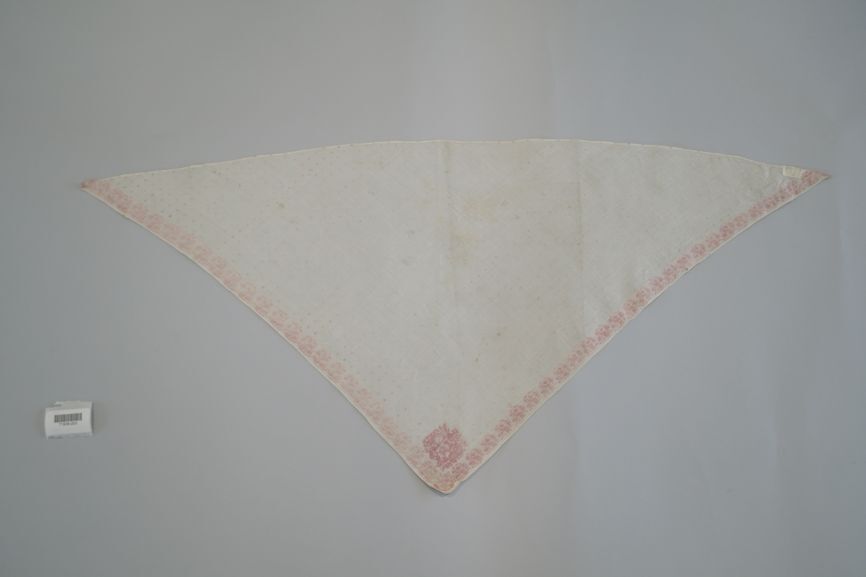 Wit katoenen driekante doek met ingeweven boeketjes en kleine roze stippen