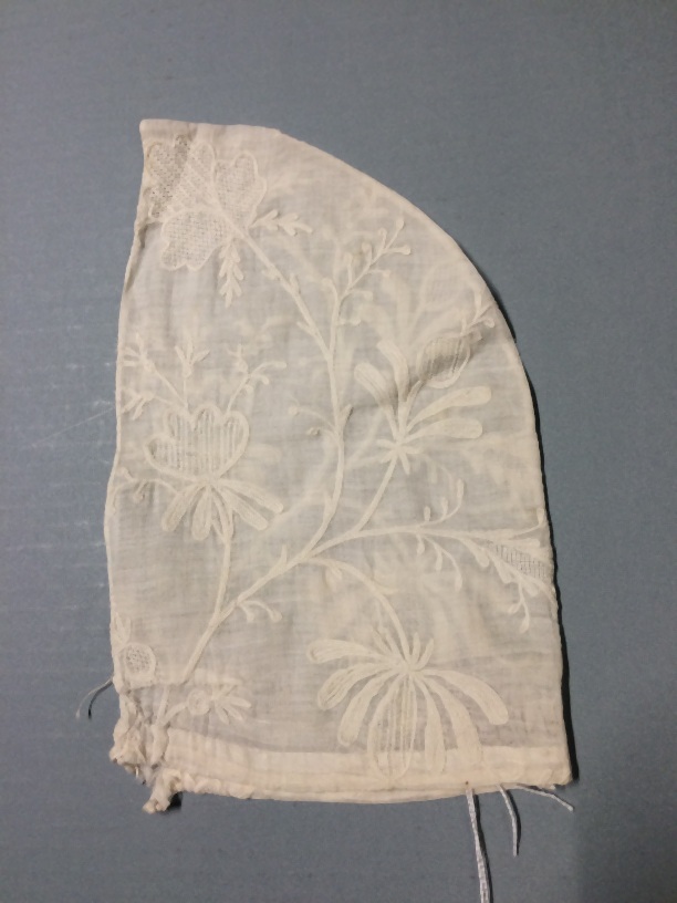 Muts van wit batist, versierd met grote bloemen in tamboureerwerk