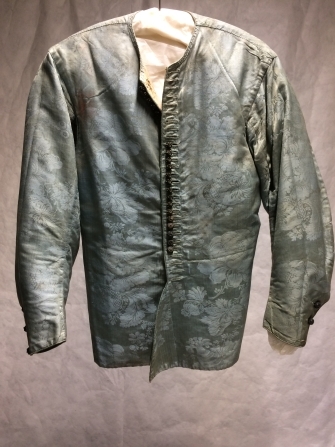 Boerenvest met lange mouwen van blauwe damast met grote bloemen