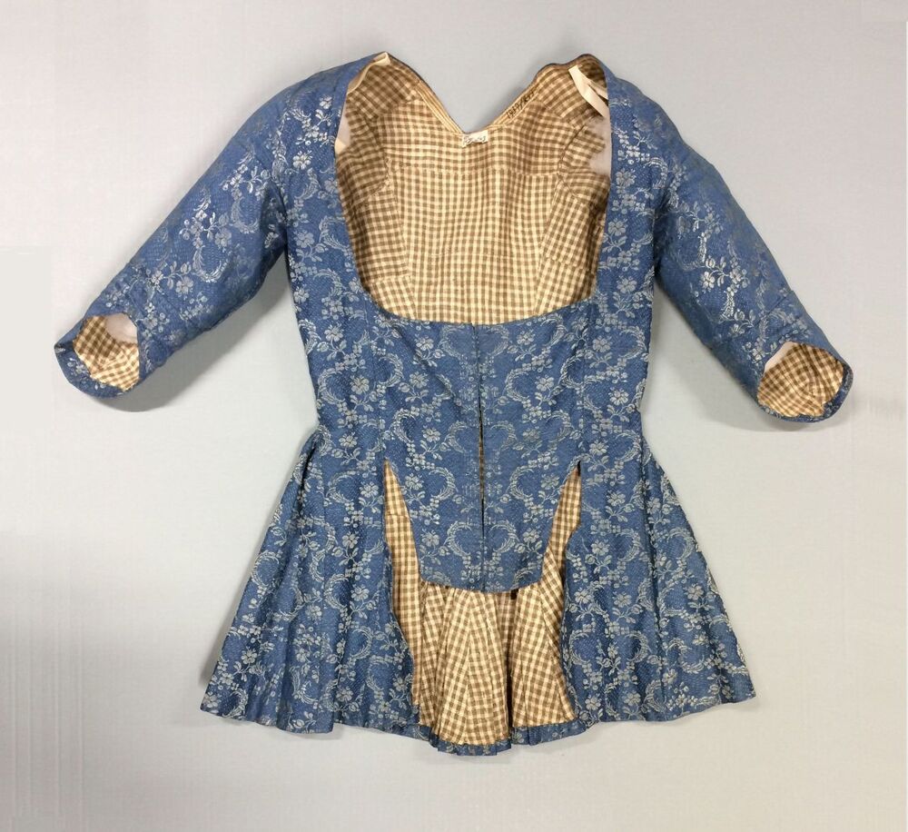 Jak van blauw-witte zijde-linnen met ingeweven bloemslingers