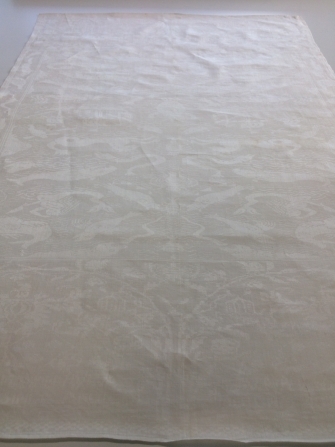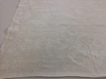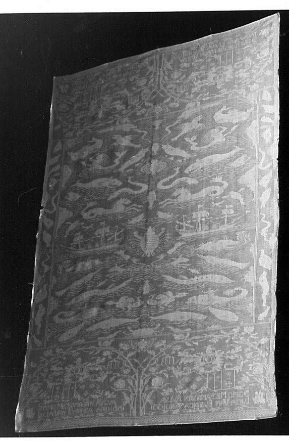 Servet van wit linnen damast, met voorstelling van zeedieren, driemaster en wapens van Scipio Meckama van Aylva en Lucia van Eysinga, ano 1661, spiegelend geweven