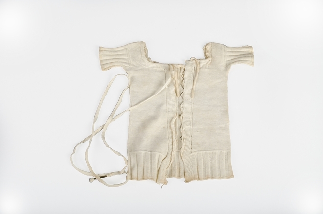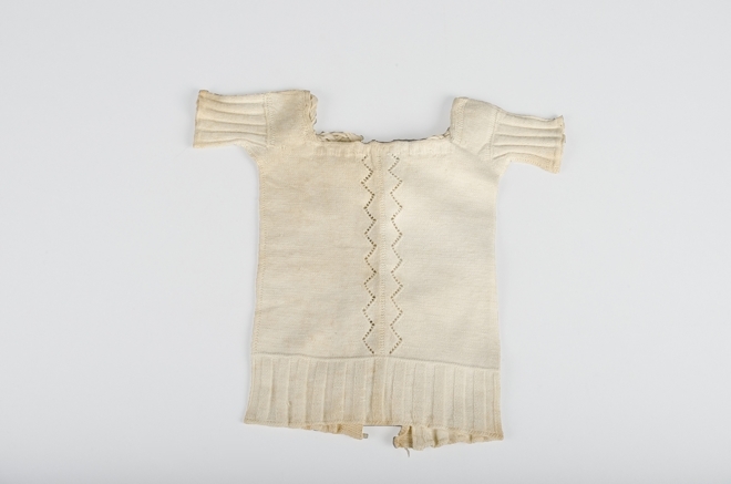 Gebreide kinderborstrok van dun katoen met korte mouwen, zigzagrand voor, rijgsluiting achter, veter met nestel, onderdeel van achttien stuks babygoed van Eelko Kingma