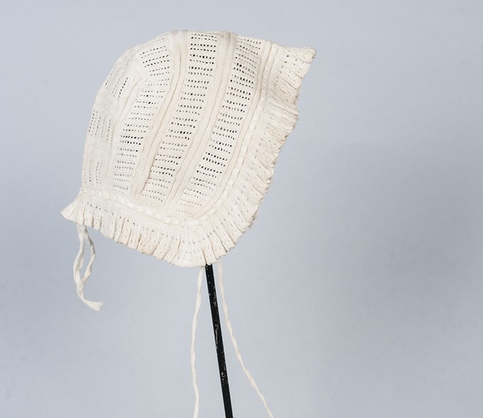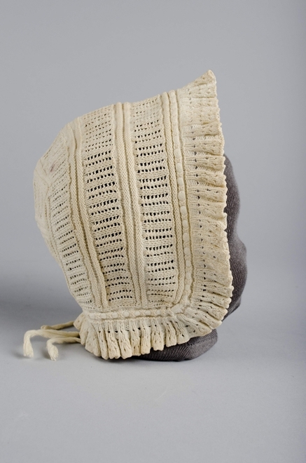 Kindermuts gebreid in dun wit katoen met ajourstrepen en ribbels, onderdeel van achttien stuks babygoed van Eelko Kingma