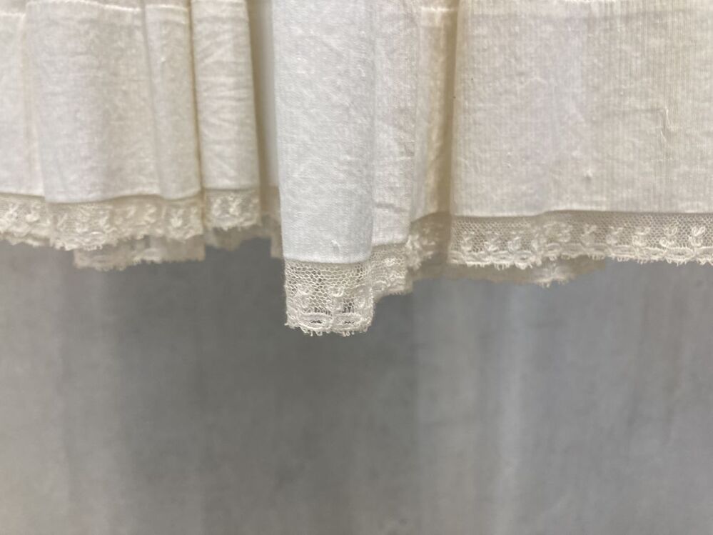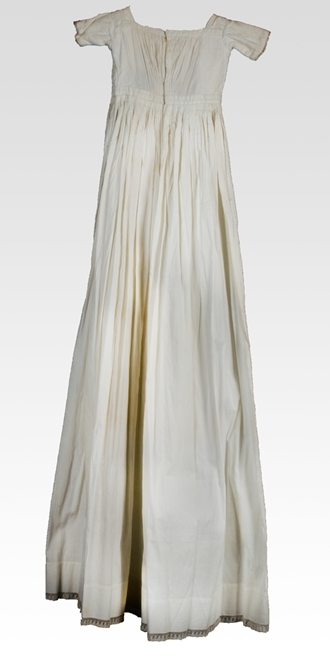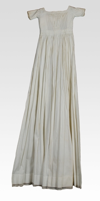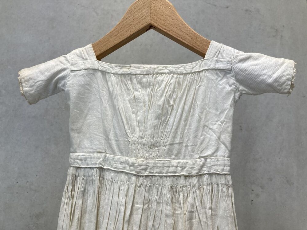 Doopjurk of draagjurk van witte fijngestreepte katoen afgezet met fijn kloskant,