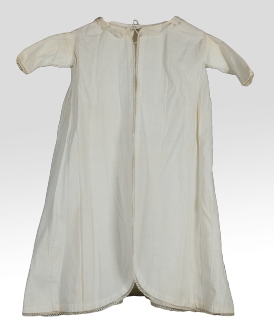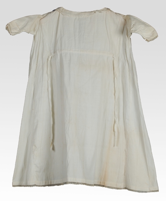 Lang jurkje of japonnetje van witte gestreepte katoenen stof aan voorzijde open