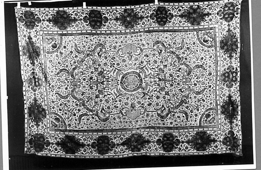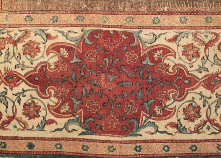 Sitsen palempore of sprei, het middenveld is geinspireerd op een Europees tuinontwerp van Berain op witte grond, in de rand zijn achthoekige schilden met rode grond