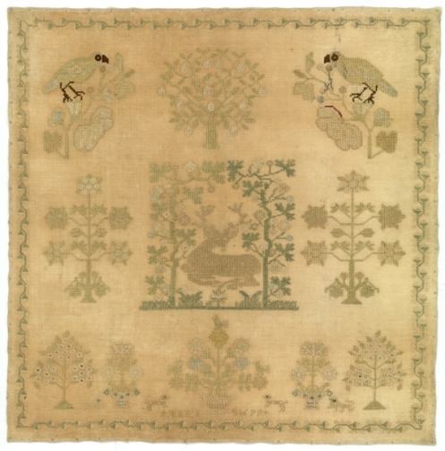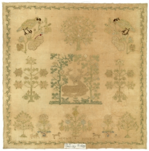 Merklap met liggend hert in een tuin en papegaaien, gemerkt I.G. 1699.