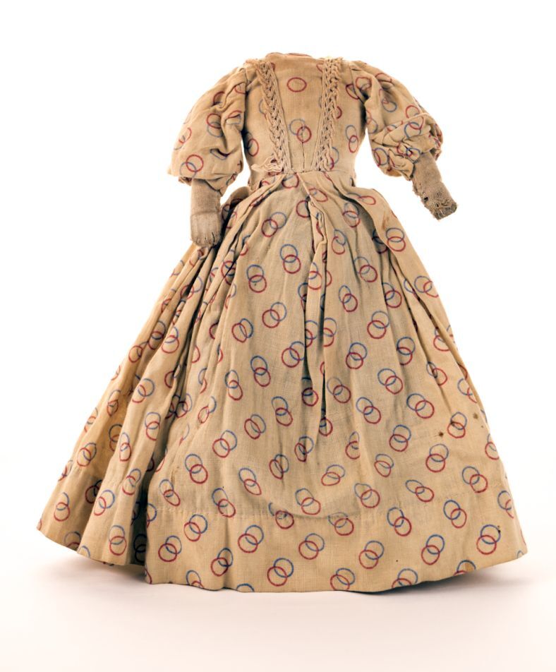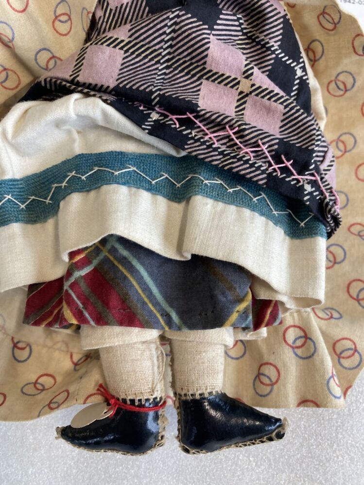 Pop zonder hoofd met katoenen lijf en zwarte zeildoek schoenen in bedrukt katoenen jurk