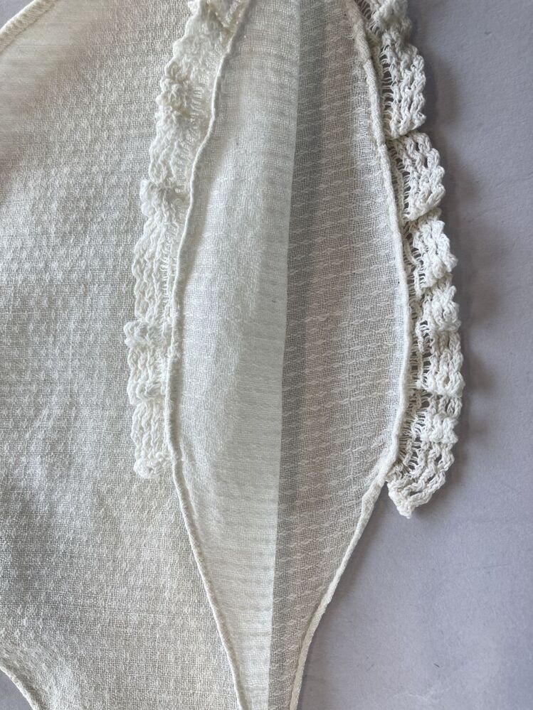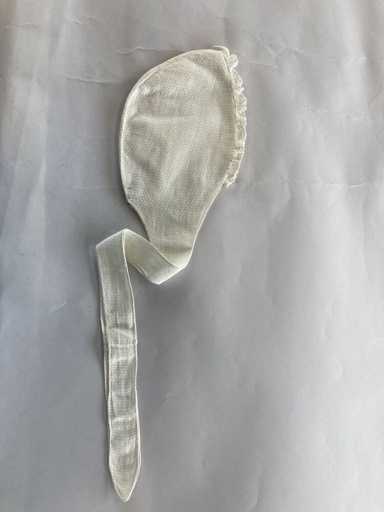 Wit linnen kindermutsje met ganzenoogjes en kantrandje met lange slippen,