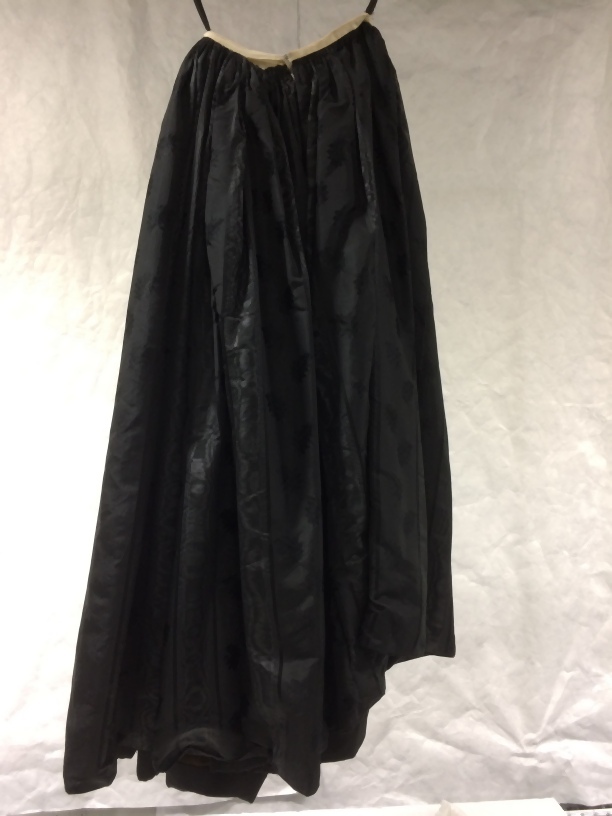 Rok behorend bij een kostuum, van zwarte zijde met moiré strepen, gedragen met crinoline