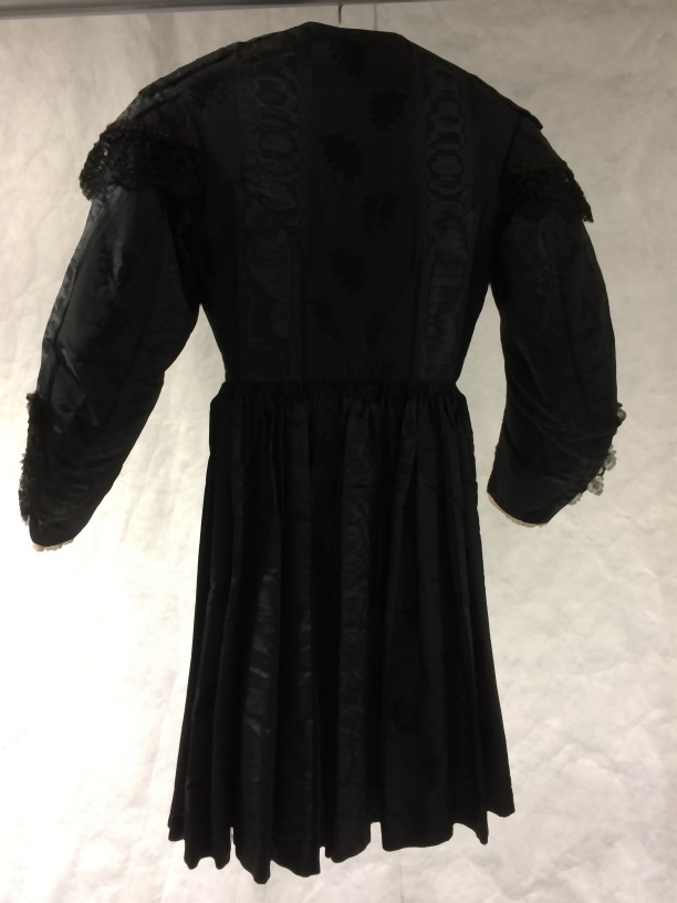 Kostuumjak met schoot van zwarte zijde met moiré strepen afgezet met kloskant met v-vormige kraag