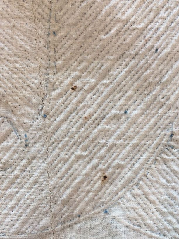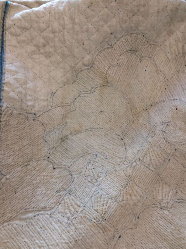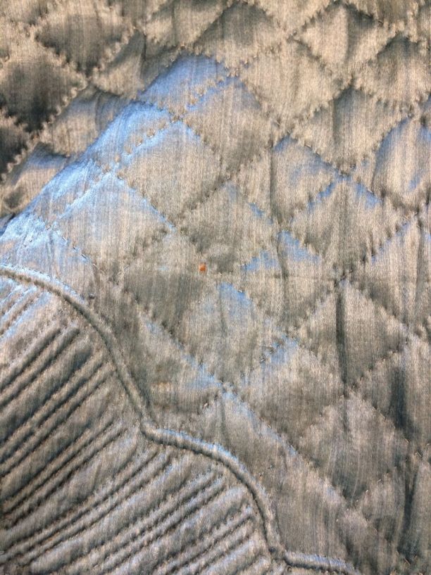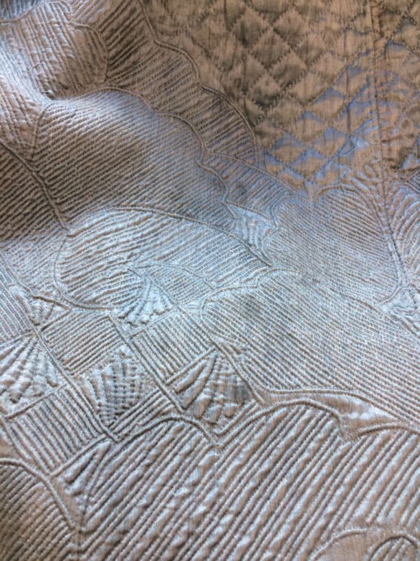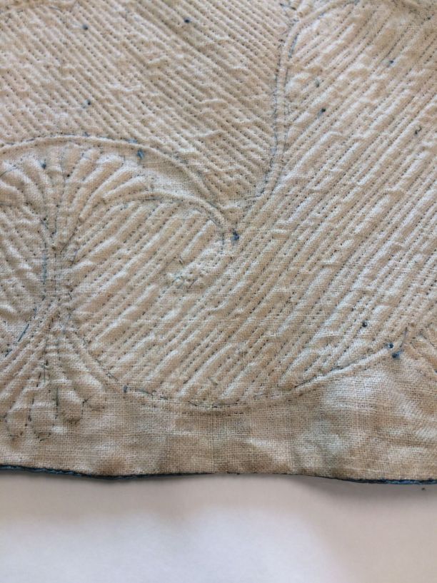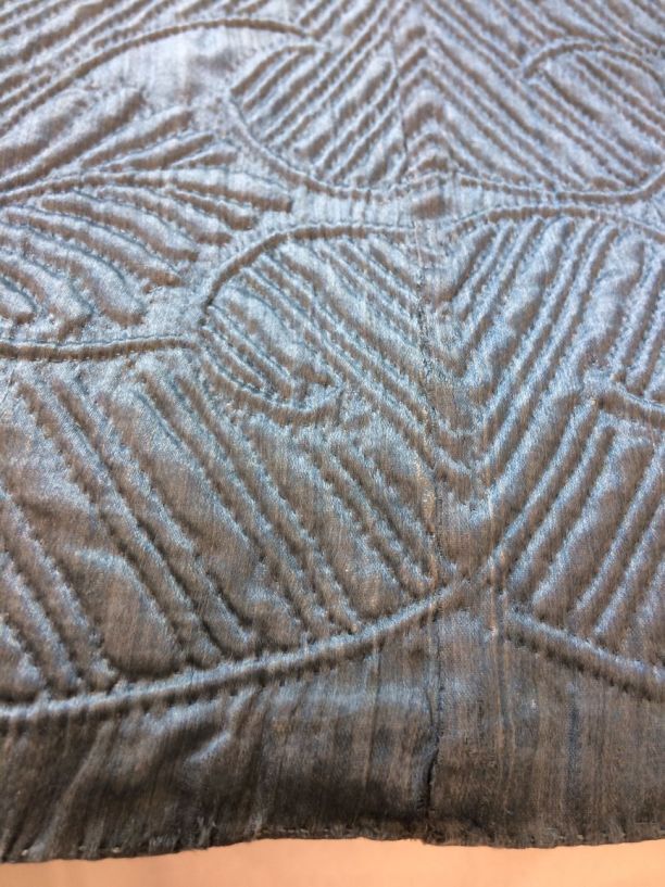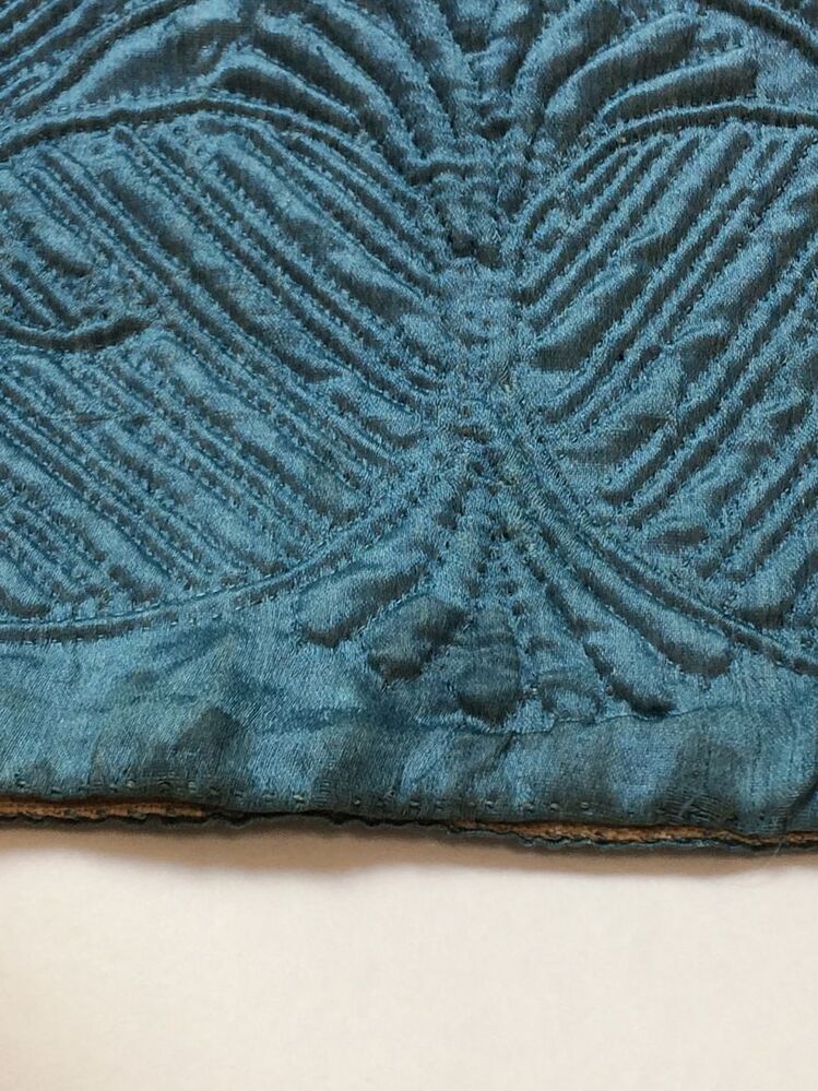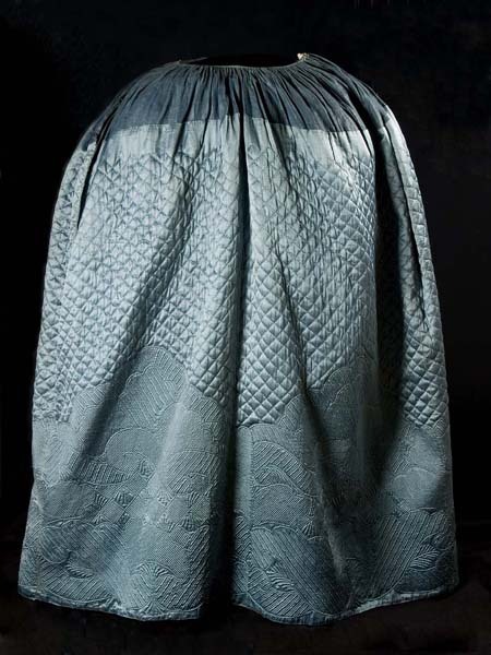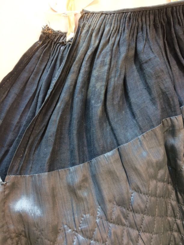 Blauwe rok van zijde, bovendeel met ruitvormig stikwerk en onder 'Zaans' stikwerk, gevoerd met wit linnen