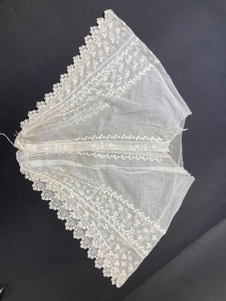 schouderkraag van neteldoek met geborduurde randen, gedragen bij trouwkostuum