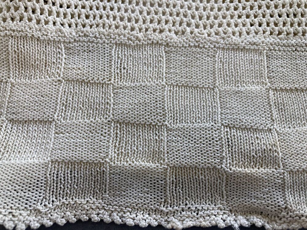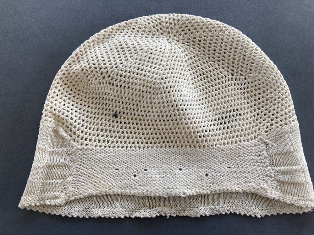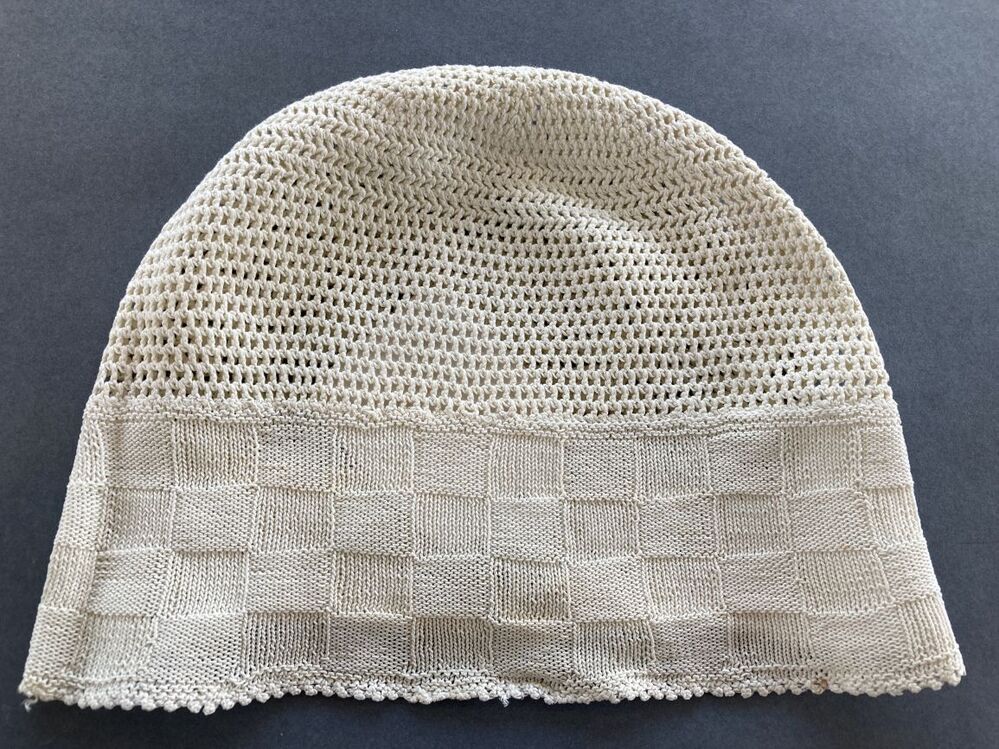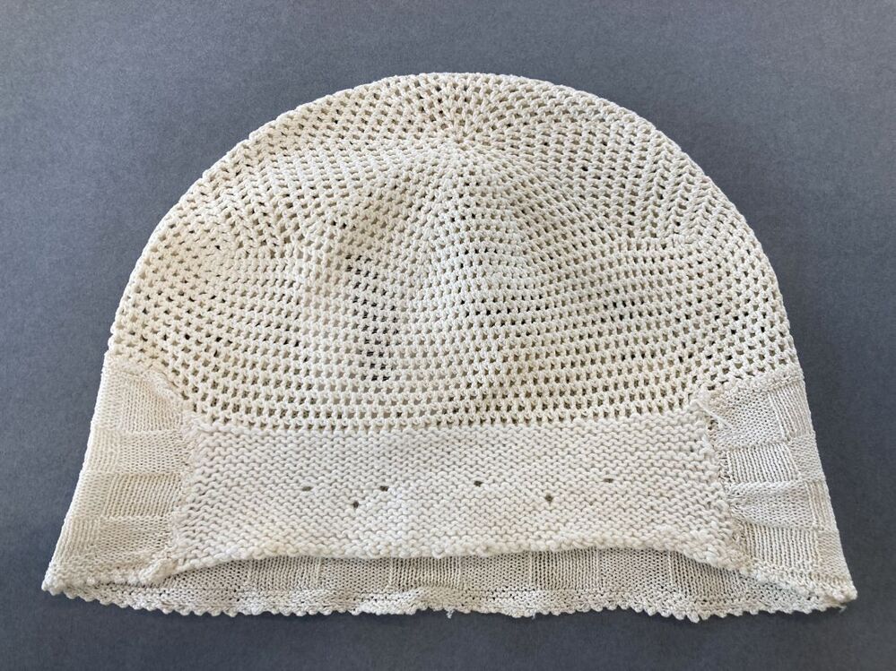 Witte gehaakte ondermuts met in blokjes gebreide strook in de nek
