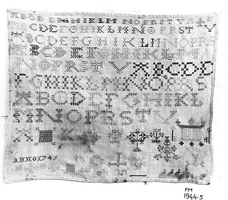Lettermerklap met zes alfabetten en enkele motieven , waarover kast en naaikussen, langs de zoom enkele muizetandjes, gemerkt A.K. anno 1749