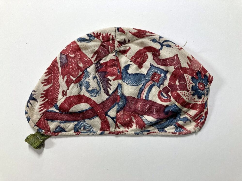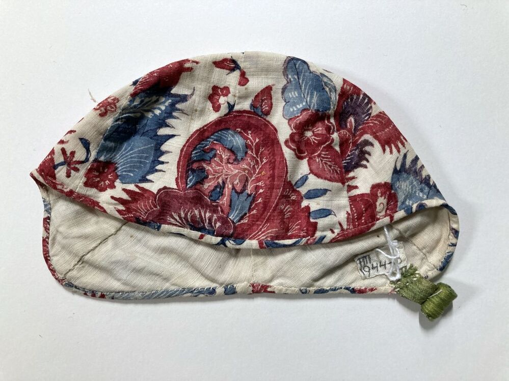 Sitsen jongensmuts, beschilderd met bamboescheuten en barokke motieven op witte grond
