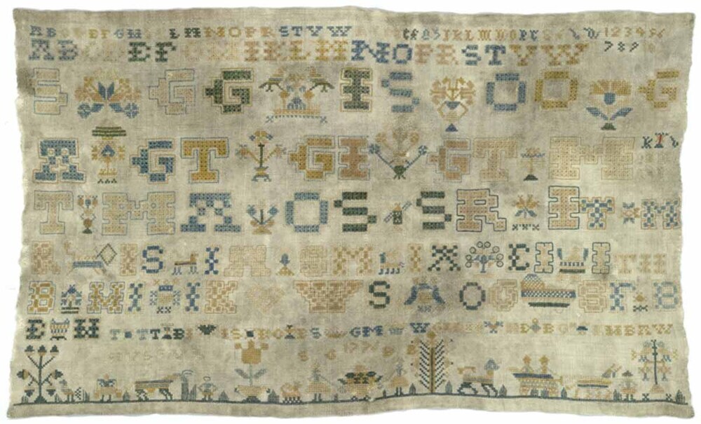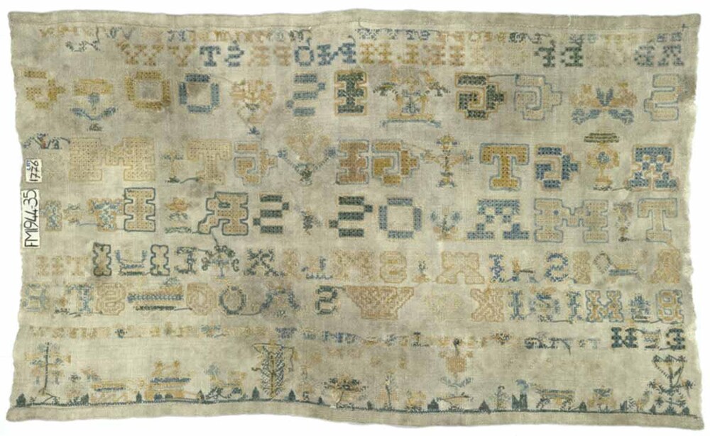 Merkletterlap met twee regels alfabetten , veel initialen en een grondje gemerkt S.G. 1776