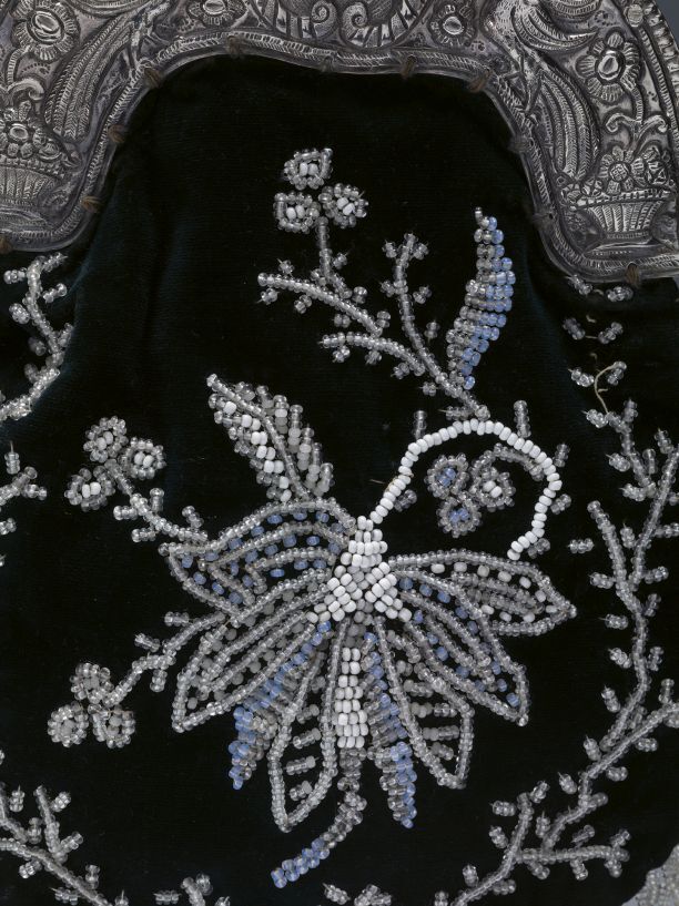 Beugeltas met aan de beugel een ovale, blauw-zwart fluwelen tas gevoerd met zwart katoen en aan voorzijde kraalwerk