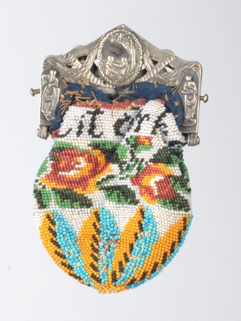 Hoekige zilveren beugel met medaillons waaraan kralenbeurs met rozen en tekst: uit erkentenis