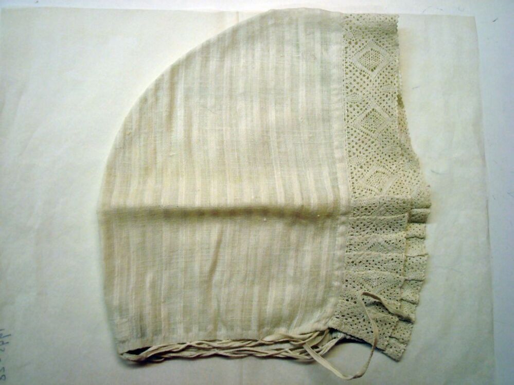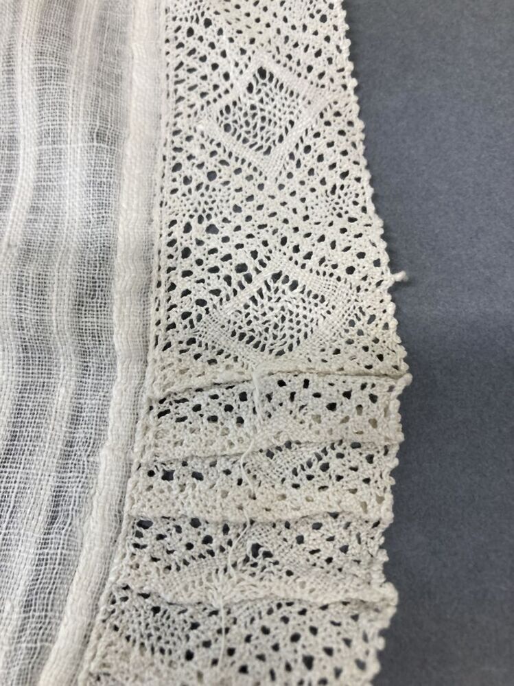 Hul van transparant gestreept katoen afgezet met torchonkant met patroon van ruiten.