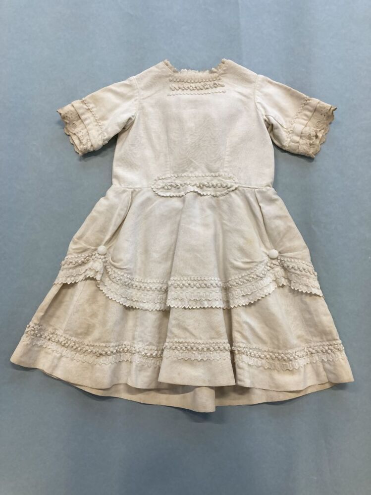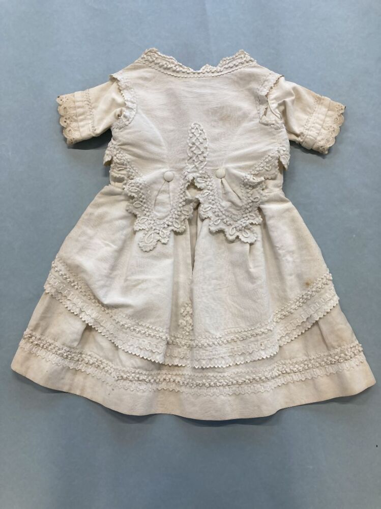 Kinderjaponnetje van wit katoen met overrokje afgewerkt met bandjes ter garnering,